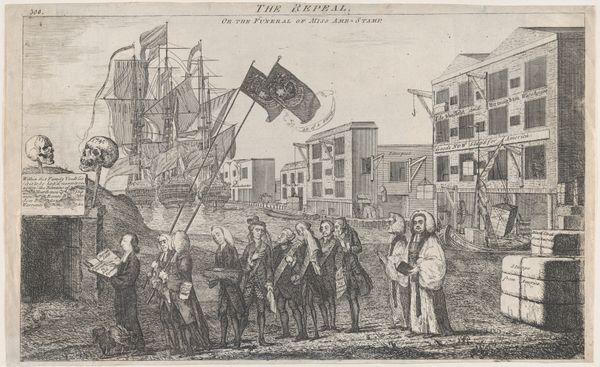 Editor: This is a print called "The Repeal, or the Funeral of Miss Ame-Stamp" from 1766. It’s an engraving, and quite satirical. It feels very staged, almost like political theatre. How would you interpret this work within its historical context? Curator: It’s definitely a performance of power and public sentiment. The Stamp Act was a pivotal moment. Look how the artist uses the funeral procession as a potent symbol. It visualizes the demise of a policy seen as detrimental to both British trade and American liberty. Editor: I see the "Miss Ame-Stamp" coffin reference in their hands, and is that supposed to be a burial vault to the left? Also, it looks like cargo being unloaded onto the docks on the right. It looks pretty detailed and crammed full of references. Curator: Precisely. Notice the merchants in the procession. They represent the British commercial interests who heavily lobbied for the Stamp Act’s repeal, fearing economic repercussions from colonial boycotts. And you rightly pointed out the ships unloading goods which highlights the restoration of trade, celebrating commerce over political control. Editor: It is interesting that they portrayed commerce in the context of a funeral, I didn't think about it from that angle. Who was this artwork for, what role did prints play in shaping public discourse? Curator: Exactly. These prints played a critical role. They were disseminated widely, reaching a broad audience in coffeehouses and homes. This wasn’t just about reporting an event, it was about shaping public opinion, solidifying a narrative around the Stamp Act as a near-death experience from which trade was saved. Editor: So it’s like political commentary, but through a visual and widely accessible medium? This print serves almost as propaganda shaping how events are perceived. Curator: In a way, yes. Think of it as a form of public service announcement and entertainment all in one, solidifying a shared understanding of a major political event. It’s visual shorthand for complex economic and political arguments. Editor: I learned something new; seeing political events from so long ago visualized. Curator: Indeed. Analyzing these prints reveals a great deal about the interplay between art, politics, and public opinion in the 18th century.
