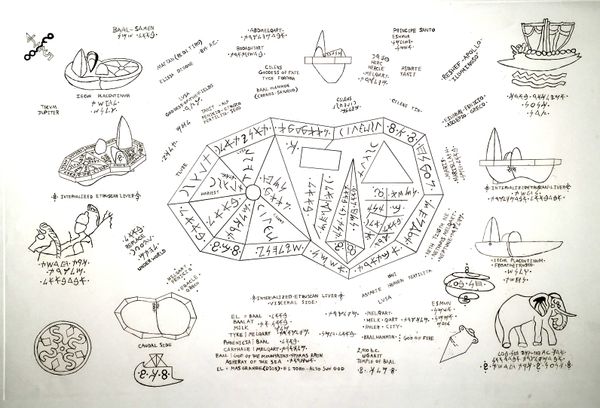 Curator: This unsettling image, titled "Map," is by Sue Coe. Coe often works with ink and mixed media, using drawing and collage techniques, to create works that challenge societal norms. What's your first reaction to it? Editor: Well, immediately, the feeling I get is chaotic and bleak. The composition feels disjointed, like fragments of a nightmare pieced together. The sketchy style amplifies the sense of unease, as if the whole thing might dissolve at any moment. What's the broader historical context she’s engaging with here? Curator: Coe is a committed social realist, and her work often confronts issues of power, exploitation, and social injustice. With "Map," her graphic narrative explores the underbelly of contemporary culture through a biting critique of capitalism and its various spectacles. Think of the 'corporate games' mentioned; she's pinpointing greed as a driving force. Editor: The "corporate games" blurb jumps out to me, too, because she has positioned it as the “greed triumphant” centerpiece of a carnivalesque wheel. I also see, further on the periphery, this promise of escape from "factory farm and dancing bears" to this "fundamental, non-denominational dead certain of God's love revival tent"... Are we talking about cultural or political disillusionment here? Curator: Absolutely. Coe's using the metaphor of a deranged amusement park to represent our political landscape and its attendant social ills, where everything from "War Carousel" to "Ship of Fools" promises empty thrills. The barbed-wire border really brings home a sense of confinement, hinting that no matter where you go within this system, you're still trapped. The work pushes for conversations around consumerism and exploitation in capitalist societies. It uses those shock tactics for impact, drawing from the aesthetics of cartoons and agitprop to dismantle accepted mythologies around capital and wealth. Editor: So, beyond the spectacle, it functions almost as a warning, or a call to acknowledge the system we're all implicated in? A "snack bar and trauma center," a place where pleasure and pain are inextricably linked... I see it as very effectively disturbing, but definitely not comfortable viewing. Curator: I agree. Ultimately, Coe's "Map" acts as a harsh indictment, forcing us to confront uncomfortable truths about our social and political realities, using biting satire to reveal structures of power at play in seemingly innocent facets of contemporary life. Editor: It makes you think twice about enjoying the ride, doesn't it?