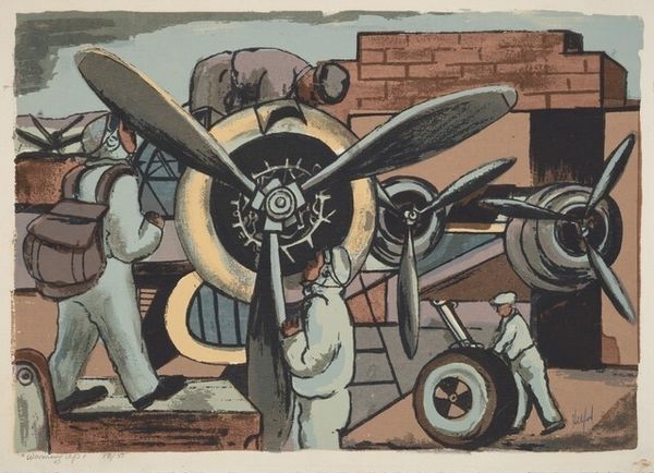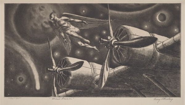 Curator: This compelling graphic art piece, likely dating to 1934, commemorates the "Vlucht van de Pelikaan van Amsterdam naar Batavia in 1933," or "Flight of the Pelican from Amsterdam to Batavia in 1933." It’s held in the Rijksmuseum, and created by Jacob Pieter van den Bosch. Editor: My initial impression is the starkness of the high contrast between the ink and paper; the dramatic diagonal thrust of the aircraft cutting across the earth map adds a real dynamism to this monochrome print. Curator: Absolutely. Thinking about the materials involved: ink, paper, the printing process...these were all part of the early graphic design industry focused on speed and efficiency, mirroring the aviation industry itself. Note how the labor-intensive process reflects a society increasingly captivated by machine production and global reach. Editor: I find it really interesting how this artwork can be contextualized within broader narratives of Dutch colonialism. The flight path symbolized progress for some, but simultaneously highlighted the exploitation of resources and people in colonized territories, right? What do you think about how race, politics, and commerce intersect here? Curator: I would note also that even the style - bold lines, almost woodcut-like appearance - serves to convey a sense of speed, the immediacy of the news, and technological advancements that were shaping perceptions of time and distance, collapsing them in real-time for those back home following the headlines. The very materiality mirrors progress. Editor: I agree, and focusing on those elements of progress reminds me to continue scrutinizing art like this for how the representation of certain bodies may be elevated at the expense of suppressing others and to unpack any lingering Eurocentric perspectives the print may present. It becomes important to question and unpack art objects in this way. Curator: That questioning is definitely critical for an open-ended experience, rather than a passively absorbed one, to encourage everyone's critical thought about the intersections between progress, privilege and power that become clear through a focused encounter like the one you highlight. Editor: Agreed. Hopefully, this discussion encourages visitors to explore these facets of the work to help promote thoughtful conversations around globalization, technological progress, and its complex sociopolitical legacy.