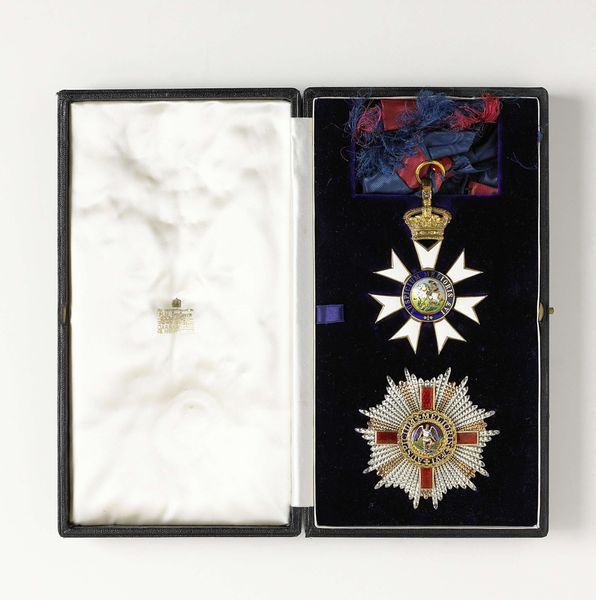 Curator: This striking piece is the Greek Order, specifically the Order of George I, awarded to Willem Drees at some point before 1954. It's an example of decorative art housed here at the Rijksmuseum. Editor: My initial reaction is how formal and hierarchical it feels. There is such carefully designed pomp and circumstance literally boxed up! The pristine velvet lining accentuates the bright metals. Curator: Indeed. Decorations like these operated within very specific socio-political contexts. Examining this Order of George I awarded to Drees gives us insight into international relations, power dynamics, and the projection of national image in that era. We must consider what message it was intended to send by both Greece and the Netherlands. Editor: Right, and who receives these honours? Drees, a Prime Minister celebrated for building the Dutch welfare state, receiving an honor from a Greek monarchy feels like a collision of different socio-political projects, doesn't it? Are these rewards endorsements of aligned ideologies or strategic alliances? It would be interesting to explore who else was given this order. Curator: Absolutely, and further exploration could uncover exactly why it was bestowed on Drees. Also, you cannot underestimate the visual symbolism present; it speaks volumes about established hierarchies and power structures in early 20th century Europe. Crowns, crosses... it's a deliberate invocation of tradition and authority. Editor: That symbolism, though…it's almost theatrical in its display of national identity and perceived 'worthiness'. Thinking about it now, the rich crimson ribbon feels like an accentuation of this 'official' history—making certain narratives very visible while shadowing others. It serves as an enduring and aestheticized memory that reinforces certain power relations. Curator: Precisely, its presence here allows us to unpack those complexities and, through its continued exhibition, critically evaluate the values and power structures these decorations sought to perpetuate. Editor: Thinking about it now, I realize how important it is to consider such items through a critical lens that accounts for historical narratives, because the real significance goes far beyond pure aesthetics and shines light on issues like identity, class, and political intention.