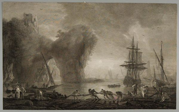 Frans Martin Dodt created this monochromatic print of "Briggen 'Lougen' angribes ved St. Thomas" using etching techniques. The composition powerfully captures a naval confrontation. The eye is immediately drawn to the dynamic arrangement of ships engulfed in smoke, with the dense clouds acting as a visual bridge between the sky and the turbulent sea. The artist uses line and form to create depth, with the ships strategically placed to convey a sense of spatial recession. The print engages with broader themes of conflict and maritime power. The billowing smoke, almost a character in itself, challenges fixed ideas about space and perception. It is a testament to the period’s fascination with capturing movement and drama through the formal constraints of printmaking. The scene is not just a depiction of naval combat but a study in the aesthetics of chaos and order.