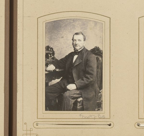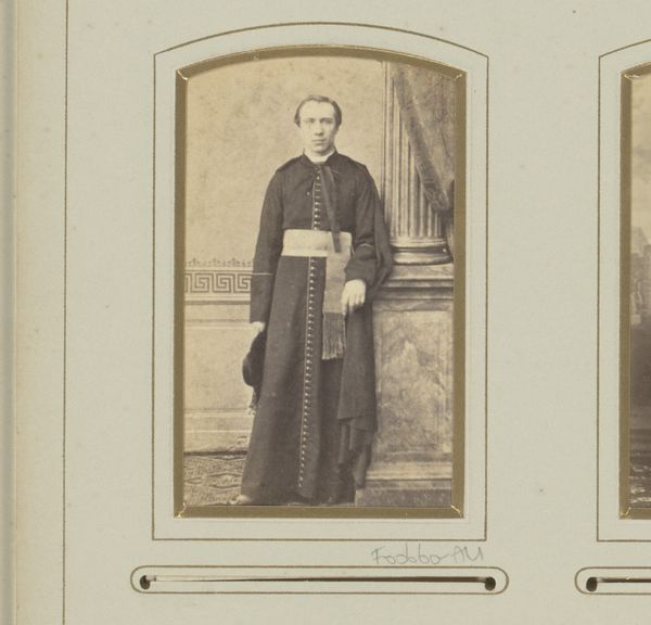 Curator: Friedrich Heuberg's "Portret van een staande man met bakkebaarden," dating from 1869 to 1879, is a compelling example of 19th-century portrait photography. Editor: He looks like he's reluctantly posing for a school photo. A serious expression and perhaps a hint of melancholy lurking in those eyes? Curator: The composition directs our focus primarily towards the sitter, who commands a central position within the frame. This choice, combined with the employment of sharp focus, throws every line of his posture into relief. It emphasizes, in effect, the deliberate, controlled presentation of self. Editor: I wonder what he was thinking. Or perhaps it’s about how limiting photography was at the time – a stiff, composed persona imposed by the medium itself. Trapped by the exposure time, unable to reflect the energy of real life. Curator: I disagree. Consider the deliberate placement of props—the ornate plinth, the drapery—as symbolic anchors, providing narrative depth. We observe also the careful modulation of light. Through it, tonal variations sculpt form, and this enhances both volume and texture within the image space. Editor: To me, these period photographs have such incredible ghostly realism. Looking into his eyes across a century and change is fascinating; the sense of him as a real person in time. Curator: This photograph reflects the realist aesthetic dominating art during that era; a push toward truthful representations. Also note the almost scientific precision within its detailing – and I feel the ambition there is to capture and classify an individual with almost anthropological zeal. Editor: Well, either way, it invites me to meditate about life in the late 1800s and I wonder what the chap was really like. What was a day in his life actually like? The image pulls you into conjecture. Curator: Ultimately, this portrait serves as a time capsule. An artifact which showcases not only a singular individual, but wider cultural values encoded in presentation, and photographic method itself. Editor: Precisely. For me, it’s this blend of presence and mystery, fixed by the alchemy of the darkroom, which keeps me staring at his photo, long after I should have moved on.