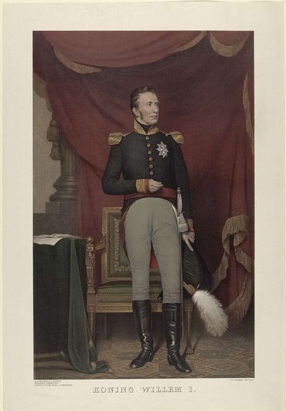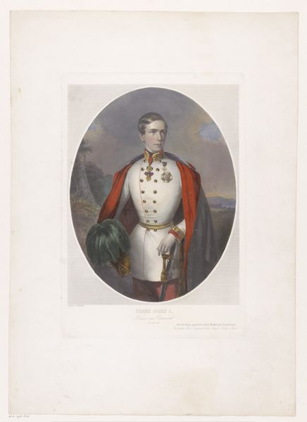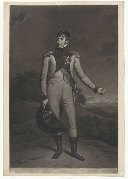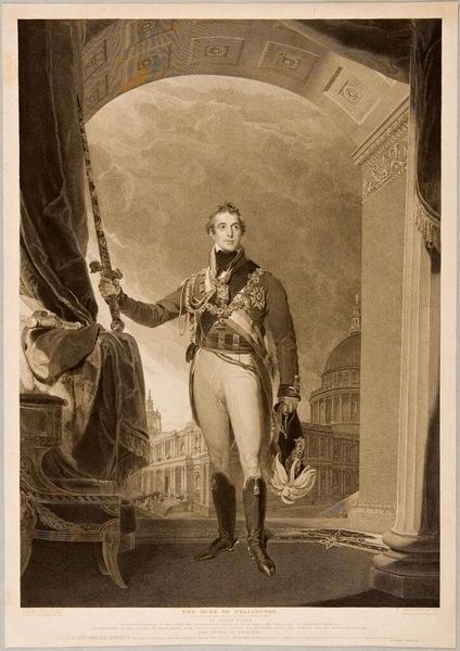 Curator: Before us we have a work entitled “Portret van Arthur Wellesley, hertog van Wellington,” or "Portrait of Arthur Wellesley, Duke of Wellington," possibly created in 1818 by William Bromley the First. It appears to be crafted with graphite and engraving techniques. What's your initial take? Editor: Immediately, I’m drawn to the textural contrast. Look at the sheen on his boots versus the dull matte finish on his coat. The piece strikes me as trying to portray immense power, maybe even wealth, and yet, it’s using some humble materials like graphite, or perhaps charcoal. Curator: The composition employs a classical structure: The figure stands framed by an archway, leading the eye towards a distant architectural vista. This arrangement clearly signifies not just nobility, but also authority and grand scale, invoking familiar tropes of power. Editor: Absolutely, but let’s think about what’s in Wellington’s hand. Is that a symbol of battle or of status? The sword in his grip contrasts sharply with the decorative helmet he also clutches. This seems less a celebration of inherent nobility, and more a document of constructed power—power acquired in his labor and then solidified into cultural symbols. Curator: Note, however, how Bromley renders the textures. The meticulous detailing in the drapery and architectural background, against the figure's smooth visage, establishes an important visual hierarchy, perhaps emphasizing intellect over brute force, suggesting that effective leadership requires calculation and restraint. Editor: Right. And someone had to *make* the paper. Someone had to sharpen the graphite. Someone had to pull the engraving. I would really be interested in tracking who was involved in those labor chains in Britain in 1818 and how many hands were on deck. It wasn't one individual working alone. That interests me more than the compositional devices on view here. Curator: While material realities indeed shaped production, let us remember Bromley’s mastery of line and form. Observe, for example, how the soft rendering of the face contrasts sharply with the defined metallic textures. These carefully curated contrasts contribute profoundly to the image’s semiotic density. Editor: Of course, this highlights class difference and social access but I find myself wanting to move away from Wellington himself to consider all the anonymous makers in service of this heroic image. Curator: It has been quite intriguing to observe how disparate aesthetic dimensions merge within Bromley’s creation. Editor: Agreed. From different points of view, certainly something worth continuing to think about.
