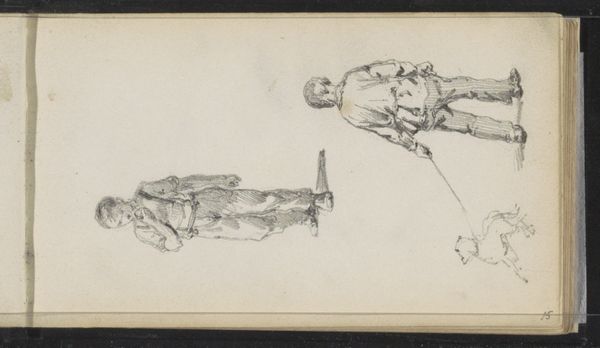 Editor: This pen and pencil drawing on paper, "Twee vrouwen," or "Two Women," is attributed to Cornelis Springer and dates from around 1860 to 1866. The sketches, quickly rendered, appear on what looks like a page torn from a sketchbook. It feels intimate, like a stolen glance at everyday life. As a historian, what stands out to you? Curator: What's striking is how seemingly ordinary scenes like this became subjects for artistic exploration during this period. The mid-19th century witnessed a rising interest in depicting contemporary life, fueled by social changes like industrialization and urbanization. The question becomes, how does an artwork like this participate in constructing or reflecting societal values? Editor: That's fascinating. I hadn't considered the connection to societal values. Are you suggesting that the act of portraying these ordinary women elevated their status in some way? Curator: It's a complex issue. While portraying ordinary individuals could be seen as a democratic gesture, granting them visibility, it could also reinforce existing power structures. Who is doing the portraying, and for what audience? Springer likely came from a privileged background. Are these sketches simply exercises in observation, or is there an intention to comment on the lives of these women, potentially for a more affluent audience? The medium also matters: sketches weren't always intended for public consumption like finished paintings. Editor: So, even a seemingly simple drawing holds layers of social commentary? Curator: Absolutely. Consider where it was intended to be seen and consumed, who was able to access and appreciate this kind of artwork, and how the act of representing these "ordinary" women shapes their place in history and memory. Think about how these images were exhibited and understood in their time. That adds so much more depth. Editor: I see! I didn't realize how much context plays a role in how we understand something as straightforward as a simple sketch. Thanks for that! Curator: My pleasure. Considering the socio-political dimensions offers such a rich understanding of not only the artwork but also the era it represents.