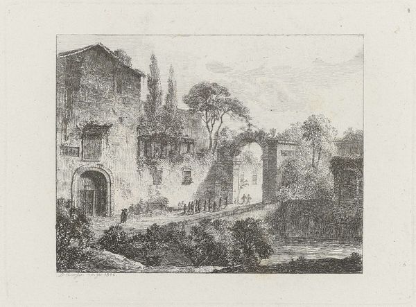 Editor: This is "Landschap," a pen, ink, and pencil drawing on paper by Domenico Quaglio, created sometime between 1804 and 1821. The detailed linework gives it a nostalgic feel, like a memory. What catches your eye, and how do you interpret this work? Curator: My attention is immediately drawn to the way Quaglio uses geometric forms amidst a seemingly wild landscape. See how the building’s architecture provides a stark contrast to the organic shapes of the trees and figures? Consider the symbolism. The architectural features often represent order, reason, civilization, wouldn't you agree? Editor: Definitely! But is it maybe a romantic ruin? I thought Romanticism celebrated nature *over* reason? Curator: Good observation. While seemingly contradictory, the Romantic era often explored the tension between humanity and nature. The ruin signifies time, history, and the inevitable decay of human constructs. It invites contemplation on the power of nature to reclaim even the grandest designs, acting as a memento mori. What do you notice about the figures in the foreground? Editor: They seem almost like an afterthought, small and absorbed by the landscape, maybe hinting at the fleeting nature of human life. Curator: Precisely. Their inclusion also hints at a narrative – perhaps travelers contemplating the past, making a connection between themselves and history, blurring the lines between the observer and the observed. What remains memorable to you after considering this drawing? Editor: I'll remember that even ruins hold symbolic power, bridging nature, humanity, and time, prompting reflection on what endures and what fades. Curator: Yes. Images preserve shared values and knowledge across generations. The enduring themes present here will speak to people for ages to come.