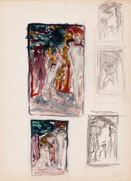 Curator: Alright, let's dive into this fascinating sketchbook page by Jiří Balcar, entitled "Study for 'My Big Week' and other sketches," dating from around 1968. It’s a pen and ink drawing that presents itself as an intimate glimpse into the artist’s creative process. Editor: It feels like stumbling across a page torn from someone's very private journal, a visual stream of consciousness, really. A little unsettling, like overhearing snippets of a dream. Curator: Dreams aren't a bad association at all. Notice how each framed sketch operates almost as a distinct, symbolic scene. There's a duality here – the immediacy of the ink drawing is contrasted against the calculated composition within each frame. Take the image in the top left frame of what seem to be people. Do you notice anything distinctive in it? Editor: Yeah! They are silhouetted against the corner of a room, or maybe a stage set. Their heavy dark fills evoke shadows, so I immediately sense the tension between presence and absence. The figures become symbolic representations of something, not actual people caught in a candid snapshot. Curator: Precisely. Balcar frequently used figuration in his work, but here, especially, it feels stripped back to its core essence, the figures as mere impressions to provoke meaning. There are other figures on the sheet. What about that lower-right one? Editor: Ooh! It has this enclosed or trapped feeling. I mean, that lower-right frame is so heavily inked. There's something ominous there – the hatching darkens the space completely, contrasting to the small figure at the very bottom of that scene, suggesting a looming sense of existential anxiety, a kind of melancholic tension. Curator: Which very nicely describes the feelings present in his artistic time. Consider Balcar working during a period of political constraint and artistic censorship in Czechoslovakia; works like this suggest an artist subtly testing boundaries through abstract symbolic means. Look at all four images - all use dark shadows as if they contain a hidden truth to reveal the continuity of figural representation as a carrier for hidden realities. Editor: I wonder if the figures serve as symbolic stand-ins for personal or societal frustrations during that period, perhaps reflecting the weight of limitations and restrictions imposed on individual freedoms and expression. Balcar's style seems less a commentary on aesthetics, and more an exploration of lived emotionality through ink and paper. Curator: I agree wholeheartedly. It provides us a powerful example of art speaking through symbols, offering an implicit, rather than explicit, kind of resistance. Editor: It is funny how such unfinished looking works can contain so much, just sitting there. Curator: Exactly, art unveils its potential and capacity as symbol rather elegantly.