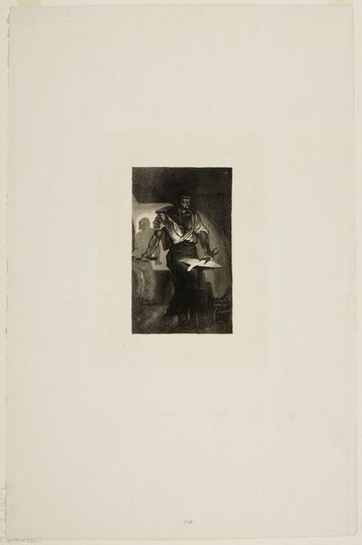 Curator: John Sloan's etching "French Antique" presents a woman in what seems like a moment of private performance. Editor: It's interesting—the limited tonal range almost gives it the feel of a faded photograph, a captured moment in time, or a memory. Curator: I think Sloan is commenting on the artificiality of the stage, maybe even societal performance through the figure. Look at the texture of the curtains compared to her dress! Editor: Absolutely. The stark contrast reveals the material artifice of the staged environment. The etcher's needle would have bitten into the plate, creating these tactile lines, almost mimicking the weaving of the fabric. Curator: I feel like she is maybe dancing just for herself, she seems very free. Do you get that? Editor: Perhaps she's dancing for more than just herself—Sloan worked for newspapers, so I wonder who this 'French Antique' was made for? Curator: I can see how that plays into this idea of performance too. Thanks for that material perspective.