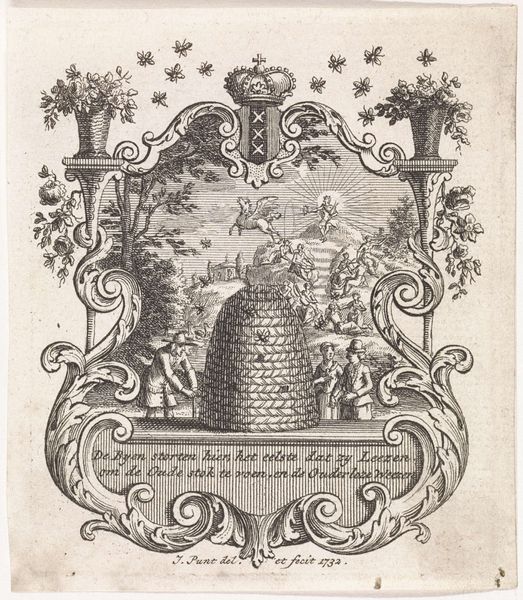 Curator: This piece presents us with the "Wapen van Ernst Casimir, graaf van Nassau-Dietz," created around 1630 by Simon van de Passe. Currently, it resides in the collection of the Rijksmuseum. Editor: My immediate impression is one of incredibly detailed and rather baroque intricacy, all rendered in monochrome. It feels almost like an elaborate tattoo design. Curator: Indeed. What’s fascinating is the medium – it’s an engraving, likely intended for reproduction and distribution. Consider the socio-political implications: a mass-producible heraldic emblem reinforces power structures through visual display. Who was consuming these images and why? The availability of engravings made displaying your loyalty relatively cheap. Editor: Right. Beyond the immediate statement of power, I'm captivated by the layered symbolism. We have the lions on the shield of course, symbols of courage and royalty, combined with more obscure figures below such as what appears to be two half woman/half bird figures framing the dedicatory text at the bottom. The symbolism presents him as almost godlike figure, divine almost. Curator: Precisely! But let's consider the labor involved. Engraving, unlike painting, is a meticulous, almost industrial process. Each line is carved into a plate, demanding immense skill and time. What does that say about the value placed on Ernst Casimir’s image, that it demanded the resources of expert printmakers and engravers to create this idealized portrayal of leadership. Editor: I see your point. The visual weight feels inseparable from its production; the detail implying care. For me though, all this heraldry feels impersonal at first glance, yet these hybrid figures below convey this hidden language of aspiration and qualities attributed to a ruler. Even with the repeated lion imagery, there's a unique psychological depth I can't quite put my finger on. Curator: I think we both find different forms of ‘labor’ represented in this one singular artwork – in the production itself, and the projection of symbolic power it represented and enacted. Editor: Definitely a work where material craft and image collide in a fascinating historical echo.