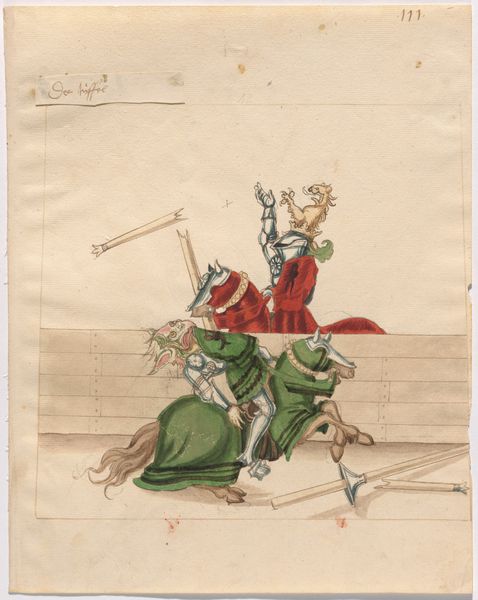 This vibrant drawing, ‘Mock Joust of War,’ was made anonymously with ink and watercolor on paper. The artist employed traditional techniques to depict a scene of medieval pageantry. The qualities of the paper support the delicate linework and translucent washes of color. The even surface allows for precise details in the armor and horse trappings, while the watercolor brings a sense of depth and movement. The drawing evokes the skilled traditions of manuscript illumination and heraldic art. The artwork has social significance as it reflects the culture of chivalry and aristocratic display. The mock joust, a playful interpretation of warfare, suggests a society where martial skills were both admired and satirized. The labor invested in creating such detailed images speaks to the patronage systems of the time, and the importance of visual representation in social and political life. This challenges the notion of craft being separate from fine art, as both require skill, knowledge, and creative expression.