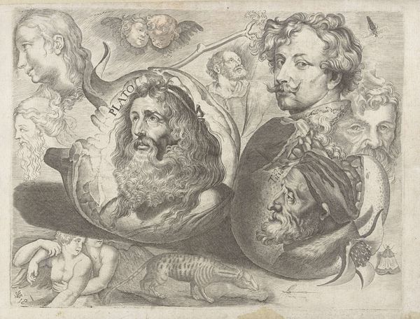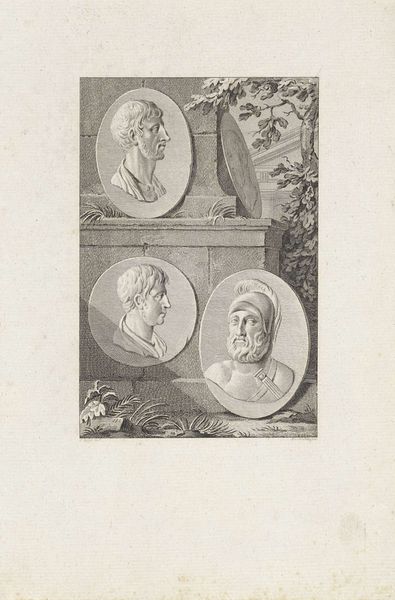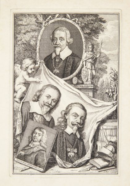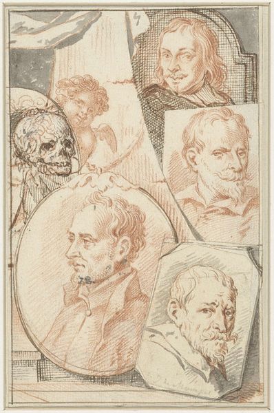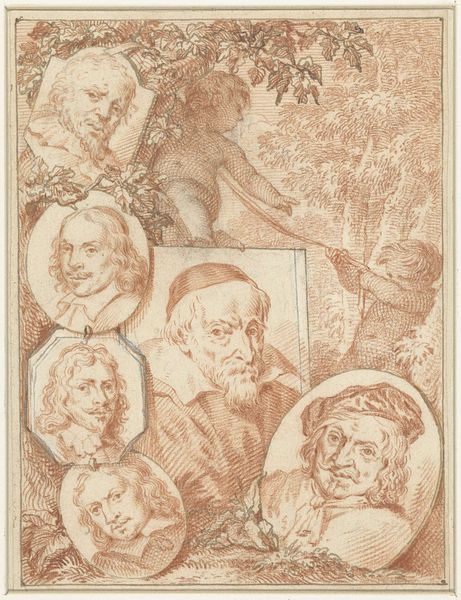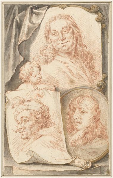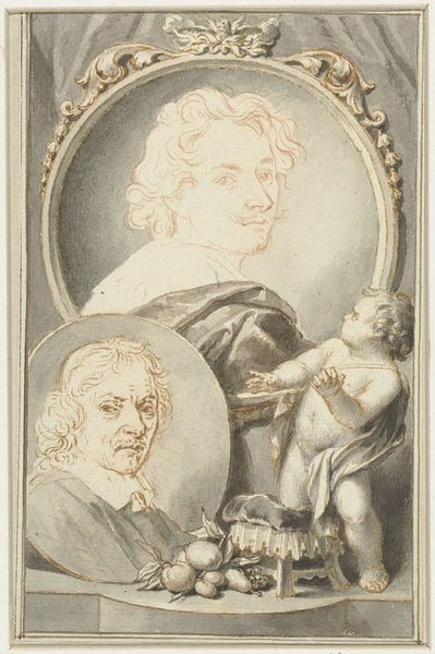 Jacob Houbraken created this drawing, titled "Portretten van Roelant Savery, Frans Snijders en Theodoor Rombouts," sometime between 1698 and 1780. This work encapsulates the Dutch Republic's art scene, reflecting a society where artistic skill was celebrated as civic virtue. Here, we see the portraits of three artists. Savery, Snijders, and Rombouts, each contributed uniquely to the cultural landscape of their time. What strikes me about this work is its layered approach to portraiture. Houbraken isn't merely depicting these men; he's presenting us with a tableau of artistic legacy. The elaborate frames around each portrait suggest a constructed sense of importance, yet there's also an intimacy, as if we're peering into the artist’s private collection. The inclusion of an allegorical figure suggests a nod to classical ideals, framing these artists within a broader cultural narrative. This piece isn’t just about individual likeness; it's about placing these men within the evolving story of art history.
