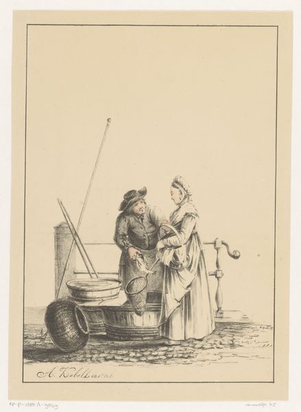 Henri François Schaefels created "Visser Ko Notebaert aan de kust" using etching techniques. The composition is immediately striking for its stark contrast between the large, dominant figure of the fisherman in the foreground and the more delicate details of the coastal scene behind him. This contrast creates a powerful visual tension. The figure’s form is rendered with strong, decisive lines that define his clothing and posture, while the background uses finer, more atmospheric strokes to suggest depth and distance. Schaefels masterfully uses line and texture to evoke a sense of the fisherman's weathered existence, embedding a narrative within the form itself. The fisherman stands solid, facing the sea, yet seems burdened by something, perhaps time or hardship. There's an intriguing semiotic interplay here; the fisherman can be read as a signifier of resilience, while the sea represents both promise and peril. Schaefels' etching presents not just a scene, but also a complex set of signs that invite us to decode deeper cultural and philosophical meanings. It compels us to consider the human relationship with nature and the passage of time.