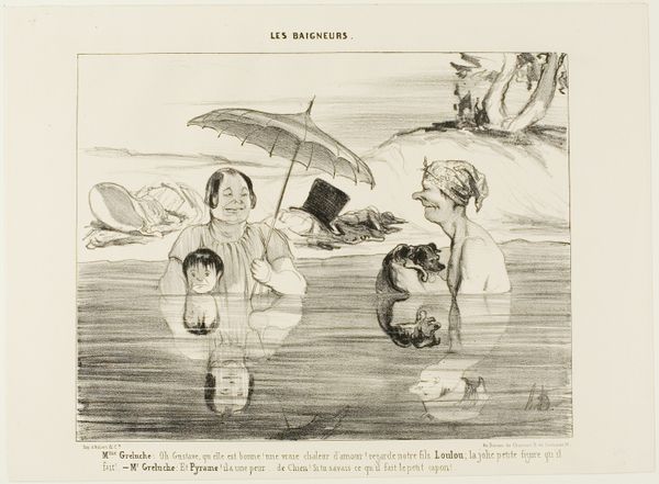Editor: This lithograph, titled "Attention, Gargouillet, v'la le bourgeois qui passe..." by Honoré Daumier, dates back to 1842. The scene captures people bathing in what seems to be a public area. I am really struck by the expressive lines, and how effectively they portray movement, and how effectively the medium suggests something comedic! What aspects of the formal construction of this print do you find most compelling? Curator: Indeed. Focusing solely on the visual composition, consider the strategic placement of the figures. Observe how Daumier uses a shallow depth of field. Our attention is immediately drawn to the foreground and middle ground where the majority of visual information resides. Editor: Right, I see it! The figures almost seem to push forward toward us! Curator: Precisely. Note the limited tonal range within the print. Daumier masterfully exploits the potential of lithography to establish contrast. We can see the effect achieved through varied densities of line work. How might that affect the viewing experience? Editor: The stark contrasts make certain areas—like the splashing water and the faces—pop. I suppose the composition and tonal values work to draw the eye. I also notice the quick, sketchy lines give a sense of immediacy, a snapshot quality. It almost seems raw, in a way, yet conveys so much emotion and movement. Curator: I find your assessment accurate. By carefully analyzing Daumier’s stylistic choices—the linearity and spatial relationships within the artwork—one may then explore its visual power. This allows for a greater understanding of Daumier's particular manipulation of medium. Editor: I hadn't considered the limited depth of field, nor how the medium accentuates tonal contrast! That has completely transformed my understanding of this piece. Thanks!