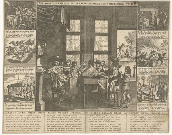 Editor: Here we have "The Foolish Virgins Conversing," a mid-17th century etching by Abraham Aubry, currently housed at the Metropolitan Museum of Art. The scene depicts a group of elegantly dressed women inside a lavish interior. There's almost a feeling of playful disorder here, with the musical instruments and open books. How do you interpret the composition of this work? Curator: Observe how the artist orchestrates our gaze. The foreground is heavily occupied with figures and objects, drawing immediate attention to their materiality. The receding space, defined by the window and fireplace, offers a calculated contrast between interior opulence and a glimpse of the outside world. Aubry manipulates spatial depth to underscore the thematic tension between worldly indulgence and potential enlightenment. Editor: So the artist is creating a tension between the tangible foreground and background elements, the latter giving a sense of escape? Curator: Precisely. Note the texture achieved through etching; the dense cross-hatching creates rich shadows and emphasizes the sumptuous fabrics, reinforcing the work’s engagement with material reality. The visual field is also structured by horizontal and vertical axes. The figures seated at the table anchor the composition horizontally, while the window and architectural elements provide strong vertical lines. Editor: It's amazing how the structure almost reinforces the idea of being trapped indoors. I never thought of analyzing it that way. Curator: Such attention to composition reveals how the artist uses visual language to reinforce his underlying themes. Are you struck by how his formal devices contribute meaning? Editor: Yes, thinking about those contrasting material qualities and how the vertical lines box the figures has really made me see the piece differently. Thank you.