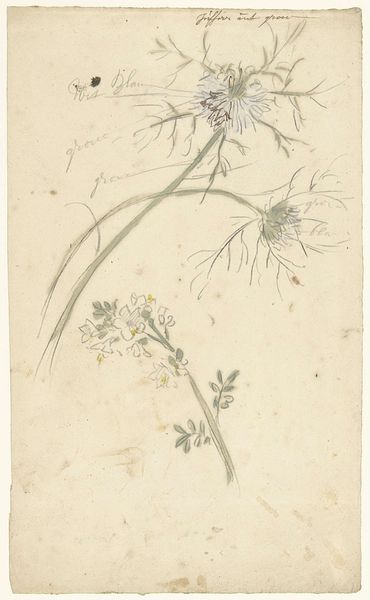 Editor: Here we have "Anjers," a botanical drawing attributed to Elias van Nijmegen, likely created sometime between 1677 and 1755. It's a delicate work in pen, watercolor, and possibly etching. What strikes me is how fragile the flowers seem, like they might crumble if you touched them. What do you make of it? Curator: Oh, fragile is a perfect word! To me, it’s a whisper of a memory, isn’t it? Van Nijmegen is almost caressing the paper with his pen. See how the lines are so light, barely there? I wonder, was he perhaps documenting these flowers from his own garden? It has such a personal feel. Almost like a love letter to nature itself. Does it feel staged to you? Editor: Not really, there is an off-the-cuff immediacy about it. But it does lack some vibrancy in color, especially compared to today’s botanical illustrations. Is that typical of baroque botanical art? Curator: That's a brilliant observation! The subdued palette suggests a different focus than mere accurate reproduction. Remember, this was pre-photography. What story is he telling about nature's temporality? I think he's inviting us to contemplate the beauty in ephemerality, the poignant fleetingness of the bloom. Do you find yourself thinking about mortality, about cycles? Editor: Definitely! I see it now. It's less about vibrant life, and more about... faded beauty, a wistful sense of time passing. Curator: Exactly. Maybe these “Anjers” are reflections of our lives as much as records of petals and stems. I always find that interesting! Editor: Yeah! I see the piece differently now, the color gives the flowers such an emotive atmosphere.