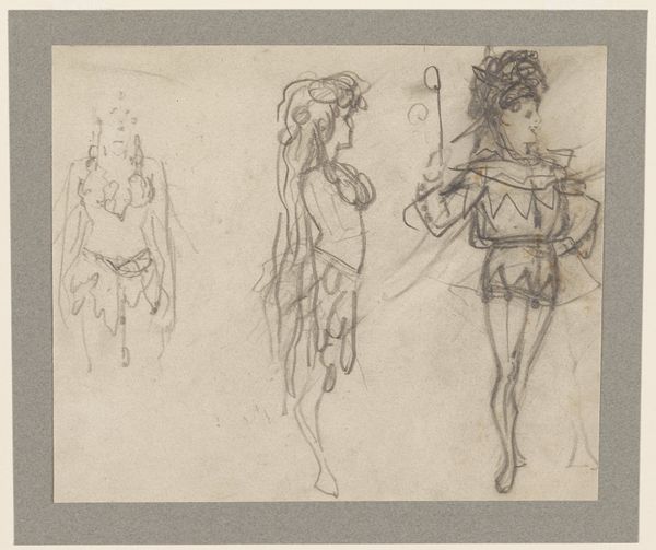 Curator: Let’s look at this piece titled "Untitled (Drawing study)" created around the 19th century by Alfred Grévin using graphite. The composition features three distinct sketches arranged on a single sheet. What strikes you most upon first viewing this drawing? Editor: I'm drawn to the contrast in styles between the figures, and the raw energy of the lines. I notice how economical Grévin is with his strokes. How do you interpret the formal relationships between these sketches? Curator: Focusing purely on its formal aspects, the artist plays with visual weight and line quality. The sketch of the woman in what appears to be a kimono presents a denser network of lines, creating a sense of groundedness. Conversely, the other larger figure possesses a lighter touch, a delicacy in its rendering that almost makes it float. Consider also how the composition leads the eye: from the detailed kimono sketch to the lighter figure and lastly, down to the very simple face, this movement orchestrates visual harmony across the paper. What do you notice about the line work? Editor: It seems very gestural and expressive, but the strokes also create form and volume through hatching and contour lines, particularly in the kimono and the detailing on the costume. Does the formal contrast indicate a difference in intended purpose, or a commentary by the artist? Curator: Not necessarily commentary. A formalist approach guides us to study visual cues first. Notice how each sketch showcases the artist’s skillful rendering of forms with a distinctive variance in line work and texture, thereby emphasizing the material expression of each figure irrespective of social commentary. I would rather consider that, to an informed eye, that would signify mastery on the artist's behalf. What have we learned today? Editor: I now understand how analyzing an artwork's structure and composition can unlock so much about artistic skill and intentionality, and offer tangible appreciation independently of knowing context. Curator: Precisely, by analyzing the composition alone, we have already appreciated much. The art lives through its very expression.