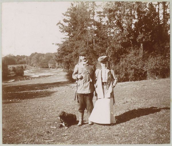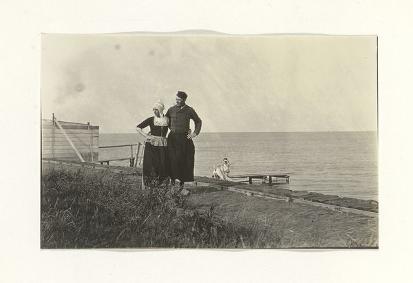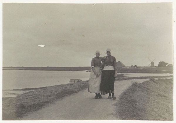 This small photograph, ‘Man en vrouw aan een water’ by G. Hidderley, captures a moment in time through the lens of early photographic technology. The monochromatic palette is a direct result of the materials and processes involved, relying on chemical reactions on light-sensitive paper to produce an image. The grainy texture and limited tonal range are characteristic of the era, reminding us of the labor-intensive darkroom practices required to develop each print. The absence of color highlights the composition and the contrast between light and shadow, emphasizing the figures of the couple as they stroll along the water’s edge. Photography at this time was not just about capturing an image; it was about engaging with the tools and chemistry that defined the medium. Looking at the image, you might consider how the photographer’s decisions – from exposure time to developing techniques – shaped the final artwork, underscoring the craftsmanship inherent in early photography. By considering these aspects, we recognize the artistry and the intimate connection between maker, material, and subject.
