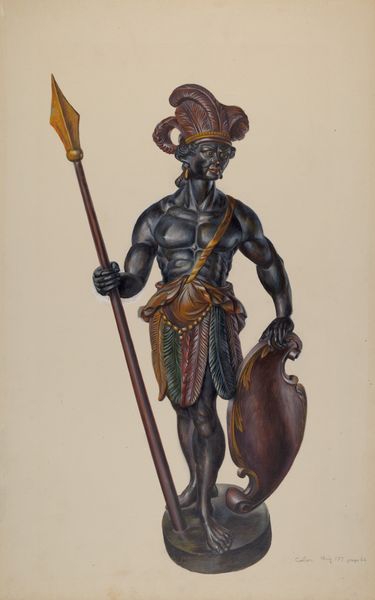 Walter Hochstrasser made this 'Cigar Store Indian' with watercolor and graphite on paper. What strikes me first is the way Hochstrasser models the figure. There's a real sense of depth and volume, like the figure could step right off the page. You can see the hand of the artist in the rendering of the wood grain effect, suggesting the feel of a hand-carved wooden sculpture. It is a carefully rendered image, yet if you look closely, you'll notice the textures are built up with tiny, delicate strokes. These marks create this layered effect, and I think it gives the surface a subtle shimmer. The artist has clearly taken his time, adding thin washes of color to build up the tones and shadows, and I really appreciate the rich, warm palette with earth tones punctuated by the reds, greens, and yellows of the headdress. I love how the artist has embraced the ambiguity of representation here. It reminds me a little of the work of Joseph Cornell, someone else with a real eye for the poetry of everyday objects. Art is always in conversation with itself, and it's this kind of playful exchange that makes it so endlessly fascinating.