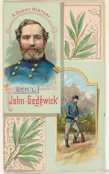 Curator: What a curious artifact. This is "A Short History of General R. S. Ewell," a mixed-media print from 1888 created by W. Duke, Sons & Co. as a promotional item for their tobacco products. Editor: It's striking how the composition divides itself into distinct visual registers, almost like a storyboard. The portrait seems lifted from an entirely different context than the skirmish below. The flat, decorative borders have a peculiar effect on the reading of depth. Curator: The juxtaposition is precisely the point, isn’t it? This isn't merely a portrait; it's a piece of marketing, entwining the romanticized image of a Confederate general with the act of consuming tobacco. The very phrase, "Honest Long Cut," attempts to legitimize both the product and the historical figure through association. Editor: You're right, the text infuses itself within the visual language—but also dictates how one processes it. The color choices and contrasting styles vying for my attention. Notice how Ewell’s soft watercolor portrait is carefully set in contrast with the sharp reds and whites of the abstracted borders. Curator: Indeed. It is a curious form of historical revisionism happening in plain sight, using the genre of "history painting," framing the Confederacy as somehow noble, right after the Civil War. Advertising's reach extends beyond commerce, subtly shaping collective memory and valorizing figures with highly questionable legacies. Editor: So, beyond the disturbing political messaging, how does its formal structure underscore that function? The symmetry feels intentionally disrupted. It's meant to draw the eye but also feels unsettling—even with its delicate rendering. The way the chaotic battle is contained, made consumable, that is truly disturbing. Curator: Precisely, by distributing these cards, W. Duke, Sons & Co. participated in a broader cultural project: constructing and perpetuating a narrative of the “Lost Cause.” In doing so, they actively disregarded the pain and injustices inflicted upon Black Americans. Editor: Now I see the significance of its disruptive elements as a perversion—as well as a formal composition that elevates product, politics, and social norms for sale. Curator: Absolutely, considering it within its social milieu offers a far more comprehensive understanding of this innocuous little card. Editor: Yes, it's hard to look away from its implications once the layers start peeling back.