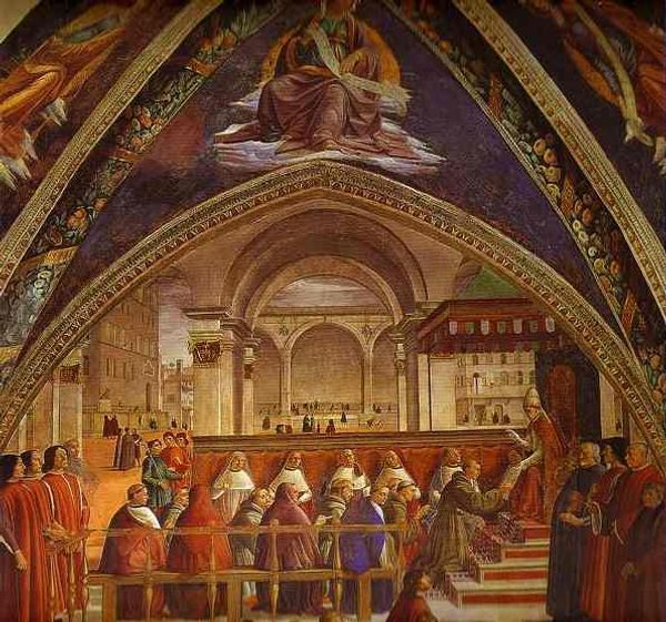 Editor: Here we have Domenico Ghirlandaio’s fresco, "Angel Appearing to Zacharias," from about 1490. The scene is so full of figures, a flurry of robes and faces. The architecture feels very precise and organized. I am immediately struck by the kind of narrative depth that makes me want to know more. What's your take on this one? Curator: Ghirlandaio had such an eye for bustling civic life, didn’t he? This fresco is more than just a biblical scene; it’s a portrait of Renaissance Florence itself. See how he places this divine visitation within such an orderly architectural framework, a bit like setting a jewel in a meticulously crafted box? The faces, so specific, so intent – who do you imagine these people to be? Editor: Perhaps donors or notable citizens? They’re certainly not just random bystanders, they look so well dressed. The story takes place at the altar, though, so I imagine there are more important subjects present. Curator: Exactly! Notice Zacharias’s surprised gesture? He's encountering something completely outside his realm of understanding, an angel in his physical reality. I’m especially drawn to the detailed, almost mundane depiction of the architecture itself. Do you see a tension in presenting a spiritual moment with such earthly realism? Editor: Absolutely! It’s as though the miracle is grounded by its setting. Without all these Renaissance figures, I'm sure it would have a very different meaning! It also makes the event feel real. It makes you feel like an eye witness of something sacred and old. Curator: Right, this blending is pure Renaissance. By placing the sacred within the everyday, Ghirlandaio invites us to reconsider the possibilities within our own surroundings, a constant conversation of mixing mundane life and art! Editor: That’s beautifully put! Thanks, that gives me a completely new way of thinking about Ghirlandaio and the Italian Renaissance. Curator: My pleasure! And thanks for asking such thoughtful questions; it’s always refreshing to reconsider old friends like this fresco through fresh eyes.