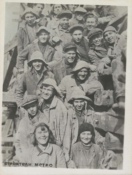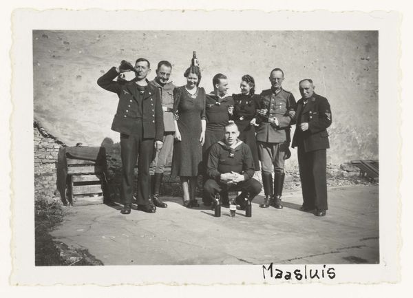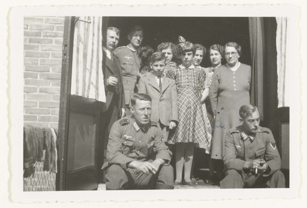 Editor: This gelatin silver print, simply titled "Wehrmachtsoldaten met Nederlanders," dates from around 1941-1942. What strikes me is how…posed, and yet somehow unsettling it is. There's a mix of smiles and serious faces. How do you interpret this seemingly staged photograph, knowing the historical context? Curator: Ah, it's a ghost in the machine, isn’t it? I imagine this was not taken by any artist but out of coercion by someone in command of the occupying forces. So many smiling faces pressed into an artificial moment – the Netherlands in that terrible suspended time. The staged happiness almost screams of unspoken tension, don't you think? Like a play put on for the cameras. Editor: Yes, it does! It feels like a very artificial and almost desperate…attempt at normality. What about the composition? Is there something to glean from how everyone is arranged? Curator: It's crammed, isn't it? Almost bursting at the seams. The arrangement says a lot: the soldiers and the civilians all packed in, blurring any clear separation. They appear equal but we can surmise who holds the power in that photograph. Editor: That forced coming together, like everyone is instructed to make do with this situation, for the sake of the picture... It is more telling than the image makers intended, that's for sure! Curator: Exactly. Look closely at those smiles, search for glimmers of authentic emotion – are those expressions of peace and hope or terror in disguise? This one photo tells a novel about all this occupation cost this nation. Art imitates strife in its attempt at reconciliation, as though reconciliation between citizens and military were ever to happen at the price of subjugation. Editor: The photograph has an immediacy and an unnerving effect. Thinking about it not as a piece of art, but as an exercise in social manipulation... it changes everything, makes the photograph more of a relic or artefact, even! Curator: Precisely, which is also precisely where art resides. So much to read in a silent, grey photograph.