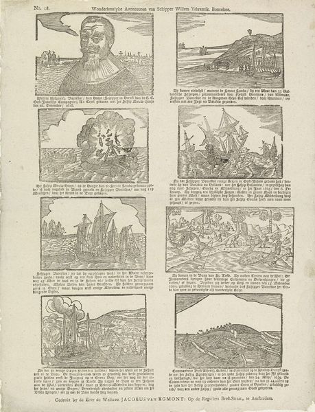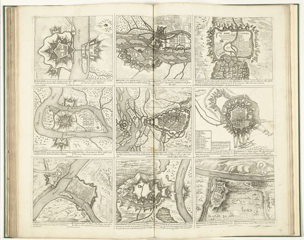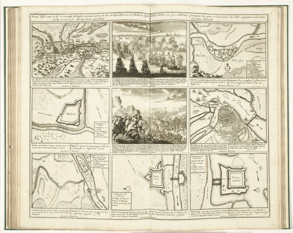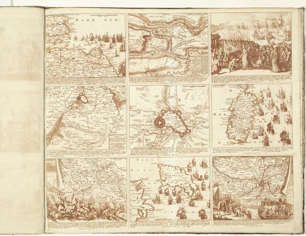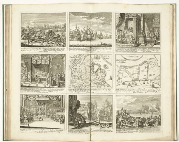 Editor: This is "Schouwburg van den oorlog (blad XVII)" by Pieter Schenk, probably from 1716 to 1722. It's an engraving printed with ink. It's so interesting seeing so many distinct scenes together like this. How would you interpret this series of images? Curator: Each image seems to carry a potent symbol of conflict and its consequences. Look closely – we have sieges, naval battles, surrenders… But they aren’t simply depictions. Each scene has echoes of power structures, social upheaval, the human cost of ambition. What cultural memories might these images evoke? Editor: Cultural memories? You mean like specific historical events people would recognize? Curator: Yes, exactly! Or broader anxieties, ideas about leadership, justice, and morality projected onto the visual field. How are power and authority represented through the poses, clothing, architecture within the frames? Editor: The figure in bed surrounded by people—is that a death scene representing loss of leadership? Curator: Potentially! Consider the dramatic conventions, the stage-like settings – each element functions as a signifier. Pieter Schenk isn't simply showing us war, but prompting us to consider the deeper, cyclical nature of conflict. What patterns or repeated motifs do you notice? Editor: There are maps, too. Almost like the land itself is a prize of war. Curator: Precisely! Landscapes aren't neutral. They represent ownership, strategic advantage. Look at how each element – battleships, conquering armies, crumbling cities—adds a layer to our understanding of the relationship between humans and the territories they claim. Does the repetition of scenes normalize these conflicts or emphasize its futility? Editor: Seeing all of this in a new way. It’s a collection of propaganda and maps of a very conflicted vision of Baroque times. Curator: Indeed, visual symbols act as powerful keys to the past. I, for one, see both triumph and devastation here.