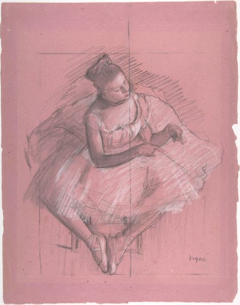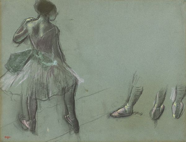 Editor: Here we have Degas' "Two Dancers," made sometime between 1874 and 1879, using pastel and drawing on paper. I'm struck by how the sketch-like quality makes it feel like a fleeting moment, almost like catching a glimpse backstage. What do you see in this piece, looking at it with an iconographer's eye? Curator: For me, the dancers are rich with symbolic potential. Consider the ballerina—historically, she embodies ideals of grace, discipline, and even a kind of unattainable perfection. Yet Degas avoids idealization; there’s a raw, almost voyeuristic quality. Do you think he is celebrating them? Or studying them? Editor: Perhaps both? I get the sense that he's interested in the labor behind the performance, all that practice and repetition, more than any sense of perfection. Curator: Precisely. That repeated practice, the almost ritualistic element, allows us to delve deeper. Notice their mirrored poses. Do they suggest conformity and discipline, or an echo of shared dreams and ambitions? The hands clasped tightly signify anticipation, and suppressed fear; together these elements tap into the psychological experience of performance and its impact on identity, don't you think? Editor: I do! That idea of performance really changes how I see the hands – I’d overlooked their importance. Thank you. I’ll definitely consider this piece differently from now on! Curator: My pleasure. Thinking about those hidden layers within something as seemingly straightforward as "Two Dancers" enriches the experience. Every element carries so much meaning and context.