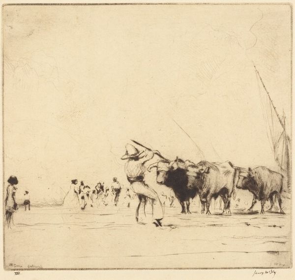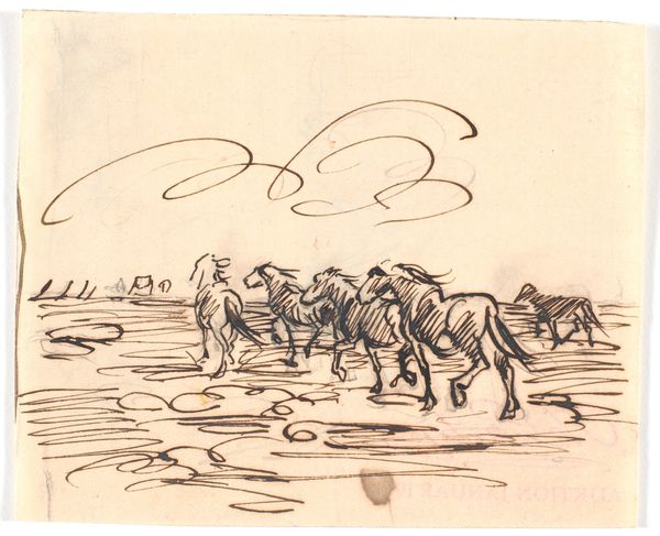 Curator: R. Stevens Wright created this work, titled "Ploughman and Horses," in 1931. It's a drawing, likely ink on paper, capturing a rural scene. Editor: Ah, my first impression is almost… melancholy. It's stark, the sepia tones lend it an aged feel, and the lines are so sparse, suggesting perhaps the back-breaking labor of farming. It almost makes me want to write a haiku. Curator: Precisely! Let’s unpack that a bit. Wright produced this in 1931. Consider the historical context. The Great Depression had begun, devastating rural communities. This drawing reflects that precarity and exploitation inherent in agrarian economies of the era. It’s about more than just pretty horses, it speaks to systemic oppression. Editor: Okay, okay, but even just compositionally, it’s striking. The horses are looming, dominating the tiny figure of the ploughman. They're dark blots, really, against the faded background. I see an imbalance—nature and labor bearing down on humanity. What’s fascinating is the suggestion of motion… yet everything feels utterly still, as if all are stuck in place. It’s like a memory. Curator: I agree; we must recognize this "stillness" within the intersection of humans and the natural world. I feel compelled to observe how class dynamics further structure social order in agrarian communities, noting in particular the gendered dimensions, how historical sources are silent about the contributions of women within this drawing. Editor: Woah, I just noticed, look how thin the lines are that connect man and beast, reins almost like cobwebs—tenuous threads binding their fates. Are they trapped in their role, bound together despite themselves? Curator: Right, it’s tempting to romanticize rural labor. The image underscores economic disparities but lacks clear reference to land ownership, obscuring Indigenous claims, while privileging settler narratives in the region at the expense of the dispossessed populations. Editor: It’s powerful how a seemingly simple sketch can contain all of this. Curator: Absolutely, and understanding the forces operating at that time highlights this artist's capacity to use simple images as a lens. We are invited to recognize a deeper analysis regarding the socio-economic conditions that formed them. Editor: Exactly! It almost feels as if that solitary figure is whispering… and we have to lean in closely to hear their story.