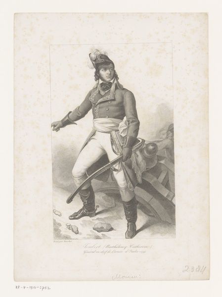 Victor Adam created this print, "Standing soldier with his hand on the helm of his sword," during the 19th century. The sword is not merely an object; it's a charged symbol of power, justice, and martial prowess. Note how the soldier's hand rests upon its hilt, a gesture we find echoed across centuries, from ancient Roman sculptures to Renaissance portraits. Consider the classical statue of Marcus Aurelius on horseback. His hand, too, suggests control and authority. This gesture evokes the *imago*, or ancestral mask, of Roman leaders, embodying cultural memory and the continuity of power. However, the soldier in Adam’s print is not mounted on a horse but on foot, suggesting a shift in the nature of warfare and leadership. This hand on the sword becomes a personal assertion of power rather than an inherited right. The sword, therefore, engages us on a visceral level. It speaks of protection, of command, and the ever-present tension between war and peace, resurfacing across history and taking on new meanings in evolving contexts.
