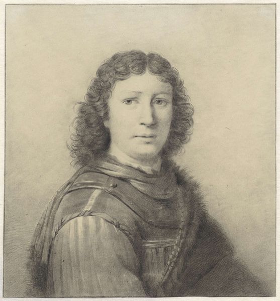 Jan Maurits Quinkhard rendered this portrait of Philips van Dorp in chalk and watercolour. At first glance, the composition feels serene, almost ethereal, due to the soft colour palette dominated by greys and subtle pinks. The artist's technique invites us to consider the interplay between line and form. The lines are delicate, almost tentative, creating a sense of movement within the stillness of the portrait. Quinkhard’s use of hatching and cross-hatching builds up the forms gradually, allowing the underlying paper to show through. This lends the piece an unfinished quality, opening up a space for interpretation. Note how the texture of the paper becomes an integral part of the artwork. It’s not merely a surface, but an active element contributing to the overall visual experience. The subtle gradations of light and shadow suggest a depth that belies the drawing's two-dimensionality. It’s an intriguing play with perception, questioning our assumptions about representation and reality.
