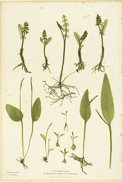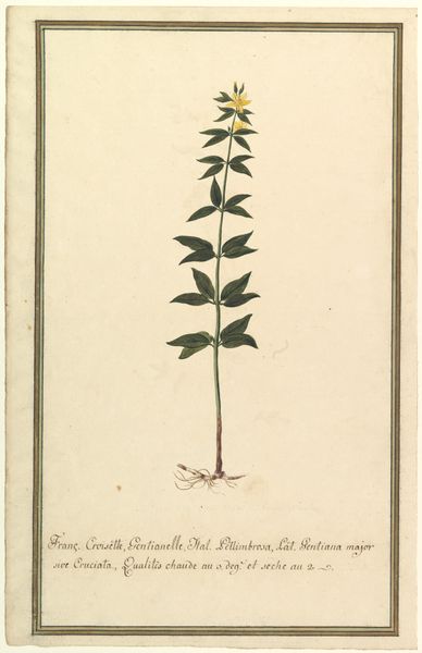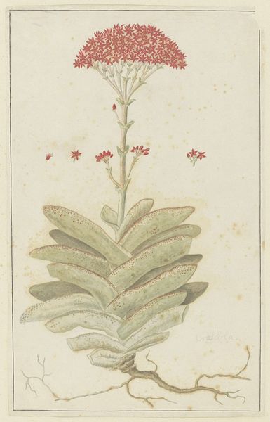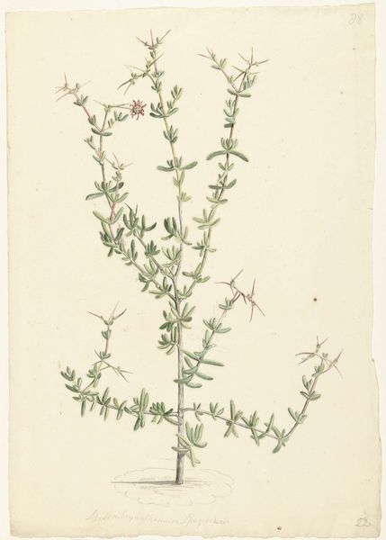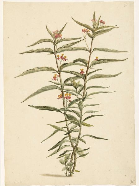 This is an anonymous botanical study of a nettle family species, rendered with ink and watercolor on paper. The composition is dominated by the verticality of the main stem, around which leaves and small, clustered flowers are organized with meticulous symmetry. The palette is restrained, focusing on the subtle gradations of green in the leaves, contrasted with the delicate whites of the flowers, all set against the creamy background of the paper. The artist’s careful attention to detail serves not just a scientific purpose, but also highlights a semiotic structure. Each leaf and flower is rendered as a sign, contributing to a precise botanical taxonomy. The use of watercolor allows for a soft, almost ethereal quality, which destabilizes the boundary between scientific illustration and aesthetic appreciation. Note the delicate lines defining each leaf and stem, creating a tension between precision and fluidity. This tension reflects the complexities inherent in the act of representation itself. It underscores the study's function as both documentation and interpretation.