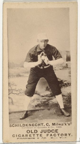 Editor: Let's talk about this photograph from between 1887 and 1890, "Daniel Eckford 'Ecky' Stearns, 1st Base, Kansas City Cowboys." It’s a print made by Goodwin & Company, and what strikes me most is the somewhat artificial-looking backdrop behind the player. What do you see when you look at this, particularly in terms of how it was made and its place in culture? Curator: Well, notice first that it's from the "Old Judge" series, explicitly connecting baseball imagery to the promotion of cigarettes. Consider the social implications – the popular sport is used to market tobacco. The staged background also points to a deliberate construction of the image. These weren't candid shots. Editor: So, the baseball card is basically an advertisement using a sporting icon. But how does that relate to the art world at the time? Curator: Think about it. Photography was relatively new. It was finding its place, its purpose. Here, we see it used for commercial means, making the everyday accessible in a collectible format. Do you think that influences how viewers at the time would respond? Editor: It probably did. They were experiencing it in a totally different way. Like a tangible and consumable piece of their celebrity culture. What also surprises me is how such an old advertisement, still, is perceived as art by collectors nowadays. Curator: Absolutely. This print, originally mass-produced and disposable, now has a significant art historical and social value, speaking volumes about early baseball, the rise of advertising, and even the social habits surrounding tobacco use. The photo reminds us that "art" can arise from many facets of our human activity. Editor: This has made me think of baseball cards completely differently! Now, seeing that image connects to marketing, celebrity culture, the growth of photography. Very insightful, thank you. Curator: It’s amazing how a small card can unlock such a rich story, isn't it?