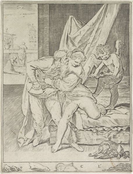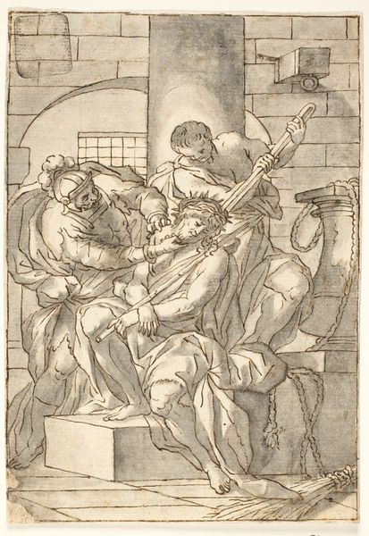 Curator: Today we're looking at Salvator Rosa's "In Vulcan's Smithy," a drawing held here at the Städel Museum, rendered in ink and chalk on paper. Editor: My immediate impression is one of weary resignation. The central figure dominates the scene, but he seems utterly disconnected from the activity around him. There’s a heaviness to it, despite the lively background. Curator: Indeed. This work speaks to broader themes present in Rosa's oeuvre: the exploration of labor and its discontents, perhaps even a commentary on class and the plight of the working man in Baroque society. We see him reclining while the forge continues apace. Editor: That recumbent figure immediately reads as Vulcan. Consider the iconography of the smith: he’s typically rendered powerful, actively forging. Rosa’s subversion, depicting him in repose, imbues the image with unexpected symbolism. Is it a comment on the nature of power itself, on divine exhaustion? Curator: That's an interesting read. Given the turbulent political landscape of 17th-century Italy, Rosa was often concerned with depictions of rebellion and social critique, using history and mythology as allegorical tools. The subtle details—the tools scattered, the fire blazing seemingly without purpose—contribute to a feeling of societal unease and unresolved tensions. The question hangs, what is being forged and for what destructive end? Editor: And the figures in the background are framed by flames! Fire representing inspiration or destruction--this element speaks powerfully to themes of change, violence and, yes, even revolution. The reclining god also brings forth the symbolism of the archetype of a disabled divinity—isolated in their power, burdened by their inability. Curator: Absolutely. And even from a materials perspective—the way the ink bleeds slightly into the chalk, creating these soft edges—emphasizes the fleeting nature of labor, the impermanence of even the most fiery and transformative actions. Editor: It's fascinating how Rosa uses such simple materials to convey such profound symbolic weight. The combination is unsettling yet invites deeper consideration. Curator: Rosa manages to make a pointed statement about society, power and work without a single, overt pronouncement. Editor: A poignant work that reveals layer upon layer of visual meaning even after extended observation.