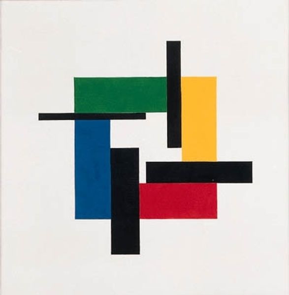 Curator: Taking a look here, we have an Untitled gouache by Sonia Delaunay, created in 1956. It served as an illustration for Tristan Tzara's "Le fruit permis." Editor: My first thought is how incredibly playful this feels despite its geometric rigor. The colors—the primary red and blue against that bold black—they really pop against the paper. It has a striking, graphic quality. Curator: Indeed. The use of gouache lends itself to those solid blocks of color, creating crisp edges and a matte finish. Consider also Delaunay's connection to Tzara and the Dada movement. The print exists not only as art object but to support a project coming out of Zurich. Editor: Absolutely. It is essential to look at the work through the lens of her broader practice. This print's creation likely represents Delaunay's economic challenges during this mid-century period. What relationship did the artist have with Atelier Mourlot, and to what extent were its lithographic standards adopted for gouache print? Curator: That tension between the aesthetic choices and economic circumstances seems to drive the direction toward applied art here. Delaunay was known for bridging those high art and craft divides. This design illustrates how artistic labor enters a different sphere when employed for book production, shifting its social context and intended audience. Editor: Speaking of the audience, let’s not forget that Tzara’s “Le fruit permis” engages with themes of forbidden knowledge and societal constraints. How might this abstract imagery complement—or perhaps intentionally clash with—the poem's subject matter? Was Delaunay working directly with the presses here to produce a fine book accessible to an informed public? Curator: That is a fascinating point. The use of abstraction itself could be a way of challenging those traditional forms, a visual analogy for breaking free from literary conventions. Editor: The stark contrasts might hint at the tension within Tzara’s poem, or maybe highlight the inherent push-pull dynamic that existed within European modernism. Curator: Looking at Delaunay's body of work with book design really brings to light the material conditions influencing the move between fine and applied art, illuminating those questions about production and social purpose. Editor: And for me, considering it as an illustration, within the narrative of both Delaunay's life and 20th-century avant-garde movements, that enriches its resonance tremendously.