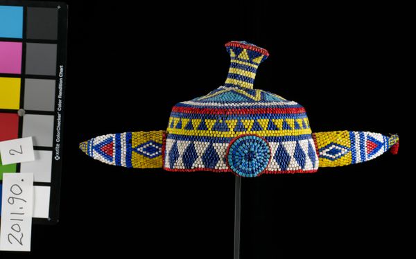 Editor: Here we have a "Hat," a textile artwork made of cotton and beads. The date and the artist of origin remain unknown. What I find immediately striking is how incredibly intricate the beadwork is, creating these dazzling geometric patterns. How do you interpret this piece, looking at its formal qualities? Curator: Its geometric composition presents an intriguing puzzle. The modular grid formed by the beads, combined with the shells, establishes a visual rhythm, albeit a static one. The pixelated effect, somewhat like a glitch, adds a layer of complexity to this artifact. Can we consider this piece, then, through the lens of semiotics as a codified system of meaning? Editor: I'm not sure. Do the colors or the placement of the beads signify something specific, or is it purely a play with form? I do like the modular aspect though. Curator: Precisely. Are we observing a self-referential system here, where the meaning is generated through the relationships between its constituent elements, or should we search for something external? Look closely at how the interplay between texture and color creates balance in the composition. This kind of relationship may unveil some key patterns in its formal articulation. Editor: So, it's not necessarily about what the hat represents, but how its components interact to create visual interest and perhaps symbolic meaning. Curator: Precisely. The power lies within the internal mechanics of the object itself, an invitation for close visual analysis rather than conjecture about its possible origin. It moves us beyond any simple assumptions. Editor: That's really fascinating. I hadn’t considered approaching it solely through its visual elements before. Thanks for providing that perspective! Curator: And thank you for encouraging such an enlightening examination!