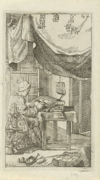 Curator: Looking at this, I'm struck by the density of detail, the almost overwhelming accumulation of objects within the scene. Editor: Yes, this engraving by Cornelis-Henricus van Meurs, created around 1720 to 1730, titled "Kitchen interior with a woman and a boy," truly gives us a peek into the material world of the time. There’s a real tension between the mundane and the… well, the quite captivating mood. Curator: That mood… for me, it’s one of quiet domesticity, but also, something a little unsettling. Notice the lighting, the shadows… they almost seem to swallow the figures. It lends a feeling of melancholy to what should be a simple scene of a kitchen interior. Then the imagery; there's the spinning wheel, which we'll see represents not just the domestic, but a traditional virtue as well as perhaps even fate or time, being relentlessly wound. Editor: Absolutely, the etching itself being an example of highly skilled labor speaks volumes. The sharp precision used for engraving renders the textures—metal pots, wooden structures—in great depth and highlights class and work ethic with a moralistic eye. Consider the production itself, engraving and printing were laborious crafts demanding significant skill and equipment, and access to markets to circulate and monetize. Curator: I agree. Beyond just documenting, the objects tell a narrative; we know those lanterns hold not only light but are probably a sign of trade with Asia; even the architectural framing has symbolism – like a proscenium arch separating spectator from stage, making you see more than is physically there. Editor: Good eye! The social hierarchy suggested is so carefully woven, right down to how meticulously it's crafted. The rat or mouse lurking on the floor speaks to the everyday fight between productivity, hygiene, consumption and nature itself. It’s about work and domestic economy. The materiality hints towards cultural narratives around family, domestic order, or societal virtue in contrast with less acceptable societal behaviour Curator: And to add, I sense even that inscription below hints to a message for how society should view certain roles played in this home. A bit on how to judge house affairs to an appropriate degree... it really calls for us to view the piece with historical insight to what society valued at the time. Editor: Indeed. By dissecting the materials and analyzing the objects depicted, one gains such a greater appreciation of how deeply embedded labor, value, and class are represented here, whilst you illuminate with its social narrative. Curator: Looking again, what resonates with me is how Van Meurs captures these intimate, seemingly uneventful moments and invests them with layers of meaning and significance. It shows us something about everyday people which persists across eras.
