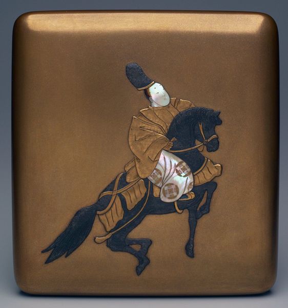 Curator: What a charming piece! We're looking at a 19th-century writing box crafted in the style of Ogata Kōrin. You can find it here at the Metropolitan Museum of Art. Editor: The first thing that strikes me is the materiality of the wood itself, that contrast between the smooth lacquer and the roughly textured load carried by the figure. And the figure itself is really striking with all those pieces of shell. It immediately makes me think about the labor involved in its creation and the potential purpose of that labor. Curator: Indeed, the materials speak volumes. The choice of wood, the precise carving, they reflect the value placed on writing implements within that era. Think of the rise of the merchant class, demanding ever more ornate and personalized goods. Writing, once the domain of the aristocracy and scholars, became increasingly accessible. Editor: Exactly. This isn't just about aesthetics; it's about access and changing social dynamics. And those minute details in the carving show a real dedication. Each piece must have taken painstaking work, from sourcing the right materials, carving, lacquering to even that shell work to capture and highlight the labor and even burden of this character. Curator: The woodcutter motif itself adds another layer. It grounds this box in the daily lives of ordinary people. Though inspired by the famous artist Ogata Kōrin who would typically produce pieces for wealthier families and shogunates, we still see the intersection of different cultures during that time and its adoption by multiple echelons. What could it say about idealized rural labor or the consumer’s self-identification with simpler virtues? Editor: Or, consider how such an image served the user. Did it inspire or offer a false sense of comfort within an emerging industrial market, maybe by placing his luxury next to a commoner? It presents an interesting commentary to its user—a space of reflection and even narrative that transcends class barriers through design. Curator: A thought-provoking piece that connects deeply with its time. A glimpse into evolving social classes and aesthetic sensibilities. Editor: Absolutely! And an example of the cultural and material values literally embedded within the artwork.