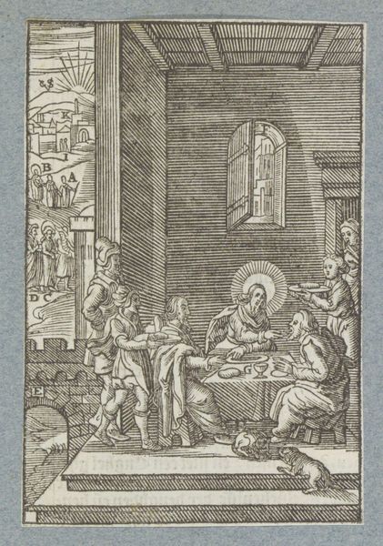 Curator: The artwork before us, currently held in the Rijksmuseum, is "The Last Supper," an engraving and print realized circa 1628 by Christoffel van (II) Sichem. It employs a linear style characteristic of the Northern Renaissance. Editor: Immediately, I am struck by the density of detail and the almost austere rendering of what is typically a very emotionally charged scene. The line work seems intentionally precise, creating a mood that is more studied than fervent. Curator: Precisely. The visual weight certainly isn't on the faces. For me, the table setting itself and the figure attending in the background stand out. I notice the figure, hunched with effort, perhaps a menial servant adding plates; they are rendered with as much clarity as Christ. What might that say about Sichem's intended audience? Editor: It's interesting you mention the setting. Note also the suspended medallion showing the *same* scene of the Last Supper from an alternative vantage, along with other possible allusions - and this repeated imagery underscores its sacred nature. What symbolic relationship do you discern there between these scenes? And consider too, what would an educated viewer in 1628 been most sensitive to? Curator: It feels like a reinforcement of religious tradition, as if the earlier moment—seen above—is always present, dictating the "correct" interpretation. But look closer at the items on the table; a flagon, plates, and cutlery all so meticulously engraved; the materials involved in communion were very real. Someone had to produce them and bring them into that upper room. Weren't these items also signs of class distinction and trade? How do they operate simultaneously in these material and religious realms? Editor: Absolutely, it’s about intertwining these dimensions. Those material realities are always embedded within, and speak to larger social systems and psychological longings. Christ at the table with wine is already rich with deep associations. By doubling it as the central image, the engraving further cements a powerful symbolic gesture. Curator: Thinking about Sichem and the processes involved to bring forth and reproduce his vision is compelling: the labor, the choice of line engraving, his dedication to minute visual encoding, and the impact of all on a devout audience of the era. Editor: A complex tapestry, where every thread contributes meaning, allowing viewers across the centuries a powerful visual connection with memory and faith.