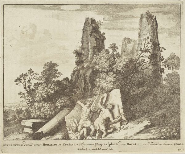 Curator: Before us, we have "Landscape with Ruin and Shepherd on a Donkey," an engraving by Johannes Gronsveld, created sometime between 1679 and 1728. Editor: Immediately, I’m struck by this overwhelming sense of decay—but a beautiful decay. Look at the crumbling architecture overtaken by nature; it’s so evocative. Curator: Indeed, Gronsveld uses the hard lines of the engraving to contrast the robust architecture with the figures seemingly undisturbed in this rural scene, but think about the work itself. The copper plate used for engraving would need to be prepared meticulously—polished, coated, the image carefully incised. A painstaking process! Editor: And it yields these gorgeous effects. Ruins always have such powerful symbolism. They whisper of empires fallen, of time’s relentless march. Even the shepherd, seemingly insignificant, stands as a testament to life's continuity amidst all that is broken. Curator: I agree, and consider how this image would be reproduced. The use of printmaking allowed for widespread dissemination. For those who couldn't travel, these images would bring pastoral scenes and classical references to their very doorstep. Think of it as the mass production of 'high art' – a democratization of visual experience. Editor: It becomes almost an allegory. The figures within the image become us, navigating through history, finding life amongst the ruins. Perhaps that's why it still resonates so deeply; it touches something archetypal within us. Even the inclusion of the donkey holds significance as the humblest of transport, or of burdens to carry. Curator: Precisely, each impression struck from the plate would carry the marks of that labor, reminding viewers of both the hand of the artist and the mechanics of the process. But it brings up an interesting dilemma for me. Is it ‘art’ or ‘craft?’ Is its cultural value in the image it depicts, or the mechanics by which the image exists in so many spaces? Editor: The beauty of it, for me, is in the blend of the two. It makes me reflect on the resilience of symbols. That this rustic scene, preserved through a repeatable artistic method, offers an escape and invites consideration. Curator: Ultimately, Gronsveld’s detailed approach to landscape encourages contemplation about a society grappling with shifts in labor, and class. Editor: It’s fascinating to consider these intersecting views. Now when I look at this landscape, I can see those narratives living side-by-side.