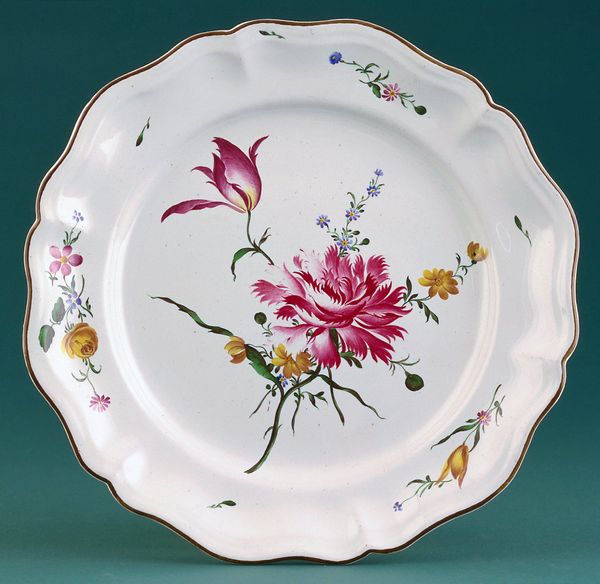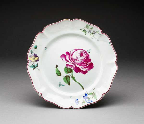 Editor: So, here we have a decorative plate, likely from around 1770, created by the Veuve Perrin Manaufactory. It’s currently held at the Art Institute of Chicago. There's a sense of delicacy and refined elegance, a bit like a whispered promise of springtime, wouldn't you say? How would you interpret this work? Curator: You've nailed it, my dear! Whispered springtime indeed. When I gaze at it, I feel like I’m peering into a perfectly arranged secret garden. The ceramic becomes a canvas for delicate dreams, doesn't it? Each little floral arrangement, carefully painted, speaks to a very particular sort of joy in the natural world that artisans back then experienced and wished to immortalize on something so quotidian like, say, a plate. Do you think there is a sense of order at work, with a clear symmetry within this plate’s asymmetry? Editor: I do see that— the flowers are loosely arranged, but strategically placed. I suppose that organized chaos is more captivating than rigid order? Curator: Exactly! Now consider the purpose, beyond pure function. Porcelain during that period signaled sophistication, so what better than to bedeck the functional with nature's beauty to signal that elevated status? It is all too beautiful to risk sullying it with supper, right? Imagine it displayed amongst flickering candlelight… it almost feels too delicate for anything but the most carefully foraged spring blossoms! Editor: So, not just a plate, but a subtle declaration, a reflection of its time! Fascinating. Thanks for unlocking the art history secrets! Curator: It was my pleasure; and the joy is in sharing it! Until our next artistic rendezvous!