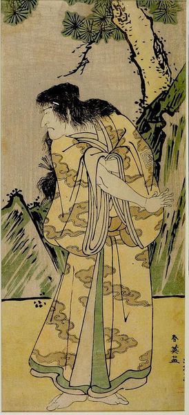 Curator: Katsukawa Shunkō's print, now at the Harvard Art Museums, features the actor Onoe Matsusuke embodying Tenjin Sugawara Michizane. It’s rendered on paper, about a foot tall. Editor: He looks so forbidding! There’s real tension in the way he grips that fabric, and in his gaze. What are we seeing here, historically? Curator: This is a Kabuki portrait, capturing a specific moment, or perhaps a famous role, which often intersects with political and social commentary of the time. Consider the actor's status, the playwright's intentions, and how the audience might receive such a portrayal. Editor: And consider how the woodblock printing process allows for the mass production and distribution of such images. The materiality of the work itself facilitates the spread of narratives about class and power. Curator: Precisely! The print becomes a vehicle for disseminating idealized or critical perspectives of prominent figures and societal structures. Editor: Seeing it this way makes the print feel less like a simple portrait and more like a complex cultural artifact.