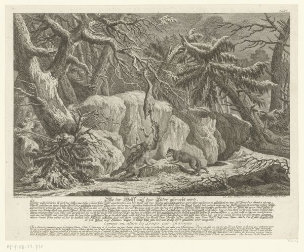 Curator: This print by Wilhelm Heuer, titled *Une scène du passage du mont St. Bernard*, dates from between 1821 and 1825, and it's rendered with lithographic precision. Editor: It immediately strikes me as incredibly bleak. The swirling winds and snow-laden landscape give a strong impression of isolation and hardship, as if the figures are completely at the mercy of nature’s overwhelming power. Curator: Indeed. It reflects a fascination with the Romantic sublime – the insignificance of man against the grandeur of nature. We see this interest play out quite frequently in the early 19th century with depictions of historical moments intertwined with extreme environments. It plays on the social role of conflict during the period following the Napoleonic era, specifically the politics of this imagery with dramatic mountain settings. Editor: Yes, it almost feels staged to some extent, even with the harsh weather elements. Who are the figures we see depicted here? I'm curious to think about it in terms of human experience rather than pure history. Curator: Well, this is meant to represent a scene from the crossing of the Great St. Bernard Pass, a crucial route through the Alps. Note how Heuer captures Napoleon’s troops, specifically. The dramatic conditions underscore their ambition and the immense challenges they overcame in battle. Editor: That adds a layer of complexity. Knowing this is a military scene forces me to reconsider. The romantic portrayal seems almost celebratory. However, these men would have also represented invasion and potential oppression to the communities they were encountering. The "grandeur" for some comes at the cost of suffering for others. Curator: Exactly. Romanticism was often employed to fuel nationalistic sentiment and glorify the military. How a society interprets history greatly affects how the image will be internalized in culture and traditions. Editor: So much shifts when we acknowledge the socio-political machine churning behind supposedly neutral art. It becomes not just a pretty picture, but a visual argument in a power struggle. I see the scene differently now. Curator: Precisely the role of art within political history. By examining pieces like Heuer’s print through the lens of its creation and the political machine for which the content would have been most useful, we are given the chance to think critically. Editor: Thank you for enriching my view, bridging aesthetic impression with historical context, helping me to rethink the scene and its actors from an analytical perspective.