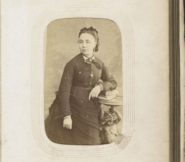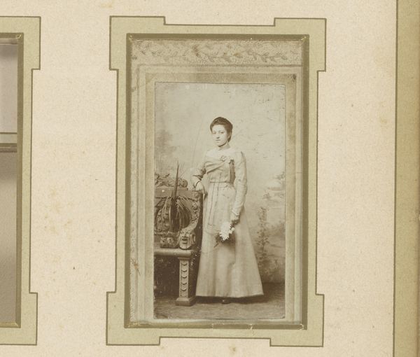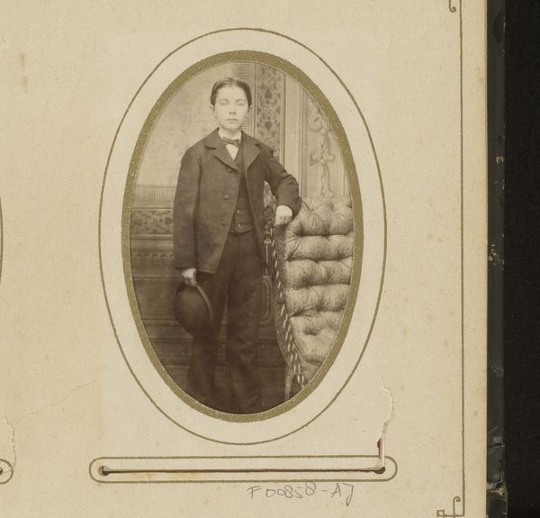 Editor: This is "Portret van een meisje, staand bij een fauteuil," a photograph from between 1878 and 1889. There’s something really haunting about the image’s subdued tones and the girl’s stoic pose. What do you see when you look at this piece? Curator: Formally, the image strikes me with its controlled arrangement of light and shadow. Observe how the artist directs our gaze through strategic tonal contrasts. The dark dress of the subject plays against the diffused, lighter background. Editor: I notice the backdrop. Does its pattern contribute to the overall composition? Curator: Indeed. The backdrop introduces a secondary plane of detail, albeit intentionally blurred. This soft contrast enhances the sharpness of the girl's figure, setting off the geometry of her clothing against the softness of her skin. How does the chair's structure strike you? Editor: It adds another layer of texture. The curves offer a contrast to the straight lines of her attire and posture, but is that enough to resolve the disjunction of forms? I’m still uncertain. Curator: The visual "disjunction", as you call it, creates a dynamic tension, doesn’t it? It underscores the photographic nature of the image itself--the act of freezing an unrepeatable arrangement of forms in space. It emphasizes the artwork's structure, inviting us to reflect on form beyond its immediate representative function. Editor: So, it’s the arrangement of shapes and tones, not just the representation, that gives it power. I’ll definitely be considering that dynamic more carefully from now on. Curator: Precisely. Understanding how an image presents itself structurally offers the means to deeper insights.