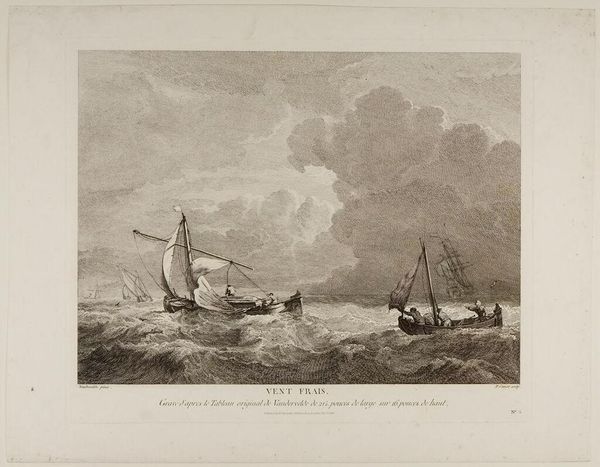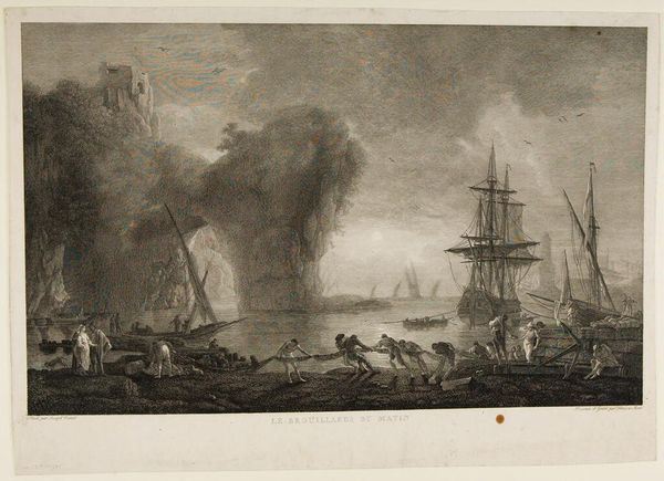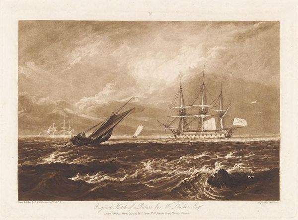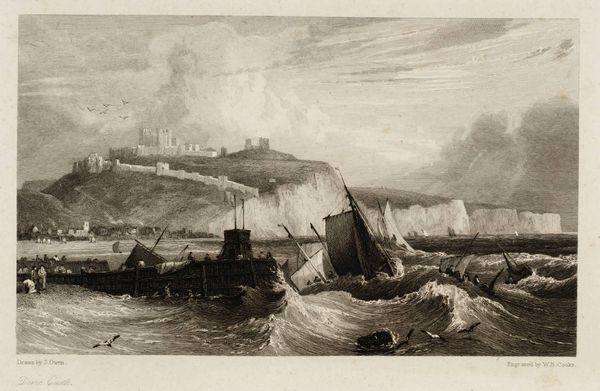 Editor: Here we have Edward Goodall's "Castle of Ischia," an engraving showing this fortress dramatically perched above the sea. The turbulent water makes me uneasy. What do you see in this piece? Curator: Well, the overwhelming power of nature is hard to miss. Imagine being at the mercy of those waves! But notice how Goodall's use of light actually leads your eye to the castle, a beacon of human endurance amidst the chaos. Does it change your unease? Editor: I suppose it's more of a fearful awe now. I never noticed the castle as the focal point before, thank you! Curator: My pleasure! Sometimes art just needs a little nudge to whisper its secrets.