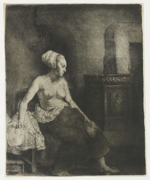 Editor: This is Rembrandt van Rijn's etching, "Woman Sitting Half-dressed before a Stove." The composition, with its stark contrasts of light and shadow, creates a very intimate atmosphere. What strikes you most about its visual structure? Curator: The distribution of light is, indeed, masterful. Note how the strategic use of chiaroscuro not only models the figure but also guides the viewer's eye through the composition. The dense hatching in the background contrasts with the relatively smooth skin of the woman. How do you see the relationship between these elements? Editor: I see how the contrasting textures and tones emphasize the woman’s figure, almost sculpting her from the darkness. The lines direct my gaze. Curator: Precisely. The formal elements function together to create a unified and compelling image. The etching exemplifies how line, tone, and texture are integrated to create the overall visual effect and reinforce the artist’s vision. Editor: It's amazing how much emotion Rembrandt conveys through such simple forms. Curator: Indeed, a testament to the power of formal elements.
