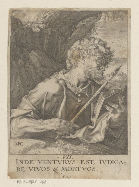 Jacques Granthomme etched Apostle Bartholomew, fixing the saint's gaze heavenward. This upward gaze, *l'occhio mobil*, echoes through art history. Consider the ancient depictions of ecstatic philosophers and prophets, their eyes rolling upwards in divine inspiration. We find this motif again and again— from the Hellenistic period to Bernini's Saint Teresa, caught in religious rapture. Here, Bartholomew’s face is bathed in light. Note the powerful emotional charge— a longing, perhaps, or anticipation of celestial union. This expression taps into our collective memory, a primal yearning for transcendence. It reminds us of Plato's cave, where the philosopher turns from the shadows to the light of true understanding. Thus, Bartholomew's upward gaze isn't just a stylistic choice but a profound symbol resonating with humanity’s enduring quest for meaning and connection to the divine. It serves as a timeless reminder of our spiritual aspirations.