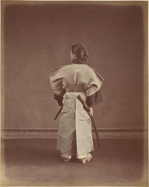 Editor: This is a photograph called "Japanese Woman with Parasol," taken in the 1870s by Suzuki Shin'ichi. It strikes me as a staged portrait, but there's a vulnerability in the woman's gaze. How do you interpret this work within its historical context? Curator: I see a potent example of Japonisme, a Western fascination with Japanese aesthetics and culture during the late 19th century. But beyond aesthetic appreciation, we need to question the power dynamics at play. How does this image participate in constructing a Western gaze onto Japanese identity, particularly onto women? Consider the title itself: "Japanese Woman with Parasol," reducing her to a signifier of exoticism. Editor: That's interesting. I hadn't considered it that way. So, the focus isn't just on the beauty or novelty, but also on the potential for misrepresentation? Curator: Precisely. This photograph exists within a broader history of Orientalism, where the "Orient" is often depicted as passive, mysterious, and inherently different from the West. How might the woman in the portrait have felt about being photographed and presented in this manner? Did she have agency in how she was represented? These are the questions we need to ask. And what's your take on the technical execution? Editor: It's definitely a product of its time – the coloring and soft focus give it a dreamlike quality. Knowing that photography was still relatively new, I appreciate its detail and artistry in capturing a fleeting moment, even though that moment was probably constructed. What else can you share? Curator: The very act of staging this photograph within a Western artistic framework is key. By looking critically at the staging, costuming, and overall composition, we can begin to unpack the complex relationship between the observer and the observed, and how identity can be shaped and distorted through representation. Editor: Thanks, I will remember that point. That gives me a lot to think about! Curator: Indeed. And it highlights the importance of continuously re-evaluating the narratives we create around art and history.