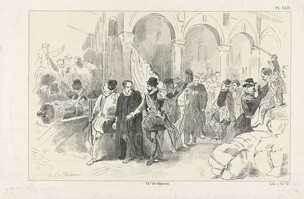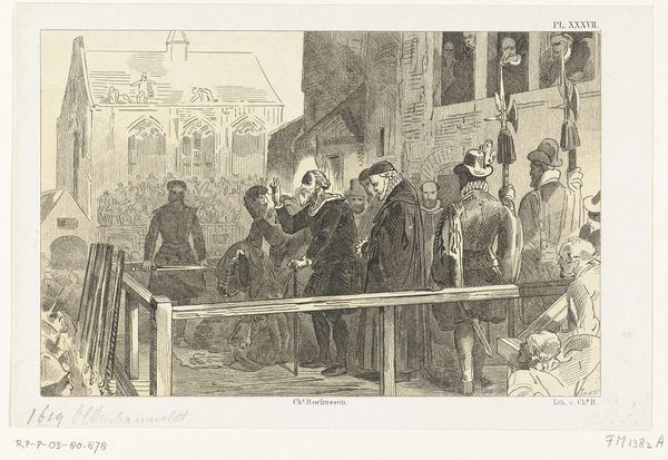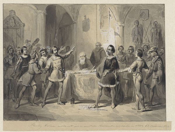 Editor: So, here we have "The Presentation of the Petition to the Duchess of Parma, 1566," an engraving made sometime between 1853 and 1860 by Jan van der Veen. It's a really detailed scene, quite formal, with lots of figures. I’m struck by the contrast between the supplicants and the Duchess enthroned; it seems to capture a power dynamic pretty clearly. What do you see in this piece? Curator: I see the engraving not just as a historical representation, but as a product of its own time, the mid-19th century. The choice of engraving, a readily reproducible medium, speaks to a desire for broad distribution of this historical narrative. What were the social implications of mass producing and circulating this image? Editor: That's interesting. I hadn't thought about the printmaking process itself as being so important to its meaning. You mean, who could access the image, and how it might have shaped public opinion at the time? Curator: Precisely. Consider also the labour involved. Engraving is meticulous, time-consuming work. By focusing on the *making* of this image, the *materiality* of it, we move away from simply seeing it as a window into the past. How might this level of detail also function as propaganda or promotion of particular perspectives? Editor: So, looking at it as more than just a depiction, and instead thinking about who made it, how they made it, and who it was *for*. That changes the way I see the artwork significantly. Thank you. Curator: Exactly. Seeing art as a product, as labor, allows us to consider its impact in the social and economic spheres, offering insight into its power far beyond just aesthetics.