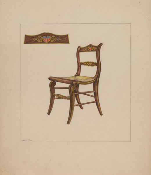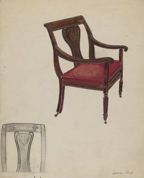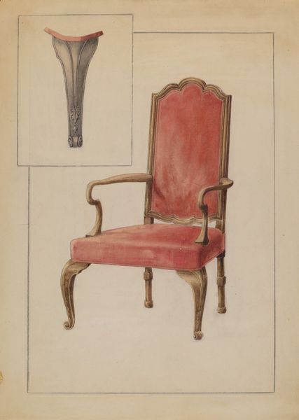 Curator: Herbert Marsh, it seems, turned his artistic hand to the humblest of subjects sometimes. This lovely, detailed watercolor and pencil sketch is called “Arm Chair” and was made sometime between 1935 and 1942. Editor: There’s a gentleness to it. And, to me, a certain sadness too. The muted reds, the loneliness of the chair sitting there… I keep expecting someone to walk into frame. Curator: It’s true; it's an empty stage. The detail here speaks volumes, doesn’t it? The precision in depicting the chair's structure, and also the texture in the seat—must have required a good deal of focused labor. One almost feels the hand of the maker involved in upholstery, the carver in wood, present in the final illustration of form. Editor: Precisely. You can almost imagine Marsh considering this design in a world on the cusp of massive change. Is it escapism, nostalgia? The chair almost feels like a yearning. This piece to me seems less about furniture, and more about the human need to surround ourselves with… what? Something comforting. Curator: Comfort or perhaps a vestige of lost traditions. He almost meticulously recorded not just the object, but the details, as seen from that partial study sketched above. One wonders if this design might speak towards issues about the economics surrounding furniture production itself – or more widely – around “decorative art.” Was it for mass-production maybe? Editor: That detail gives the artwork itself some breath too. More to the object. But I am touched particularly by the coloring: a delicate use of watercolor to pick out both light and shade...It brings a weightless, dreamlike, quality… not simply like an inventory sketch for some production run. This is also a celebration—or the ghost of celebration, depending on one’s mood. Curator: True, an element of hope perhaps or that longing perhaps also reminds us now. Looking back as this chair reminds, of our changing values, desires and, indeed the materials around us during all such challenging times. Editor: It’s left me contemplating things – comfort and loneliness as well. An artwork does it for me.