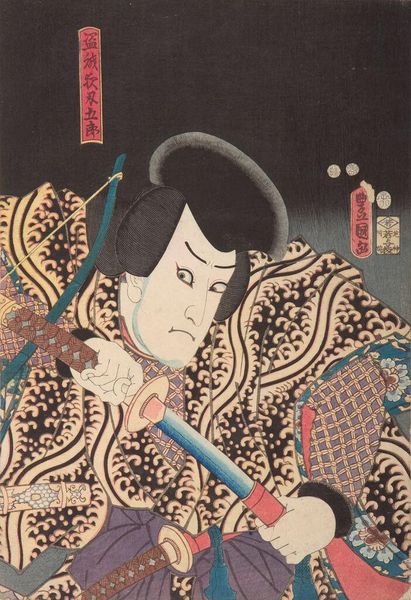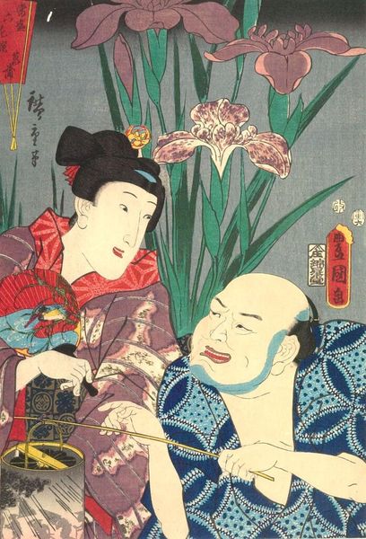 Curator: This woodblock print from around 1860 is entitled "Modern Gallants with Morning Glories" by Tsukioka Yoshitoshi. It's an ukiyo-e piece. Editor: My eye immediately goes to the vibrant color contrasts. The dark blues of the background offset those incredibly rich, warm reds in the figure's tattoo and the flowers. What a fascinating tension! Curator: That vibrant tattoo provides an interesting lens through which to examine societal shifts in Japan at the time. These gallant figures, with their elaborate tattoos and fashionable attire, were often associated with a counter-culture rejecting traditional norms. Editor: Exactly! The materials and labor involved in producing such an intricate woodblock print, particularly one that flaunts this counter-culture through the motif of a tattoo, makes one wonder about the relationship between production of art and production of social identity. Curator: Absolutely. Yoshitoshi was working within the established ukiyo-e printmaking system, yet the imagery subverted some of the strict societal expectations of the time. His focus on individualism challenges traditional notions of group identity. The art displays how urban life was starting to flourish under pressure from the West. Editor: Thinking about the printing process and its economic context is so key here. Woodblock prints were relatively accessible, bringing these images of modern life and rebellion to a wider audience. Also, the act of creating this particular work questions traditional boundaries around art and craft. This wasn't high art intended only for the elite. It was accessible art meant to engage the common person and perhaps provoke debate, thus fulfilling art's important social role. Curator: Yes. I agree with your assessment of the social element in Yoshitoshi's work. His approach, rooted in realism yet laced with poignant observation, creates an engaging tableau that reflects his time while inviting continued introspection about social issues. Editor: Absolutely. Seeing how the craft itself pushes at the boundary between personal adornment, printed art, and social critique – that is what really animates this ukiyo-e for me.