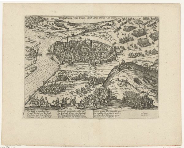Editor: We're looking at "The Siege of Alkmaar, 1573," an engraving and etching, so a print, from sometime between 1573 and 1575. It's at the Rijksmuseum. It’s striking how this city is positioned within the landscape; it feels vulnerable, yet defiant. How do you interpret the imagery here, especially considering the history surrounding it? Curator: It's vital to consider how images like this served a very specific public role. Prints such as these helped to shape public opinion and commemorate events, especially during times of conflict. We see Alkmaar rendered with great precision, but surrounding it are the markers of siege and warfare, clearly aligning the print with the Dutch Revolt. The 'truth' of the event is less important than how this image functions as propaganda and a celebration of Dutch resistance. Consider who commissioned this work and the message they were trying to spread. How does that change the way you perceive its accuracy? Editor: That makes perfect sense. So, this isn’t necessarily about showing what happened as much as inspiring patriotism? Curator: Precisely. It's a political statement visualized. The heroic defense of Alkmaar was used to symbolize the wider struggle for independence from Spanish rule. And even the *choice* to depict a landscape reinforces a sense of national identity tied to the land itself. Editor: I never would have considered it that way, but understanding the social context really transforms my understanding of the image. Curator: Exactly. Analyzing the artwork in this manner provides a rich understanding. Editor: I’m beginning to grasp how the seemingly simple choices, like depicting a landscape over portraits of leaders, actually shapes a national narrative. Thank you.